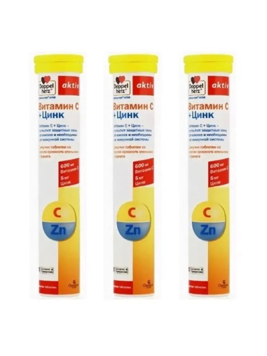 DOPPELHERZ ACTIVE VITAMIN C + ZINC - effervescent tablets with the taste of red orange and pomegranate. Vitamin C and Zinc - improve the body's defenses and are necessary for the immune system. - Have antioxidant properties, protect cell membranes from the damaging effects of peroxidation - Stimulate the immune system, increase the body's defenses - Have anti-inflammatory properties The recommended daily dose (1 tablet) contains: - Vitamin C 600 mg - Zinc 5 mg Nutritional value: 1 effervescent tablet contains 10 kcal / 45 kJ proteins 0 mg fats 0 mg carbohydrates 3.5 g Instructions for patients with diabetes: 1 effervescent tablet contains 0.05 XE Why is vitamin C (ascorbic acid) useful: - participates in the production of collagen, which is part of our skin, bone and cartilage tissue. - is an antioxidant, removes free radicals. - is necessary for the synthesis of interferon, which in turn fights viruses. - has an anti-inflammatory effect. - promotes the absorption of iron and zinc by the body.