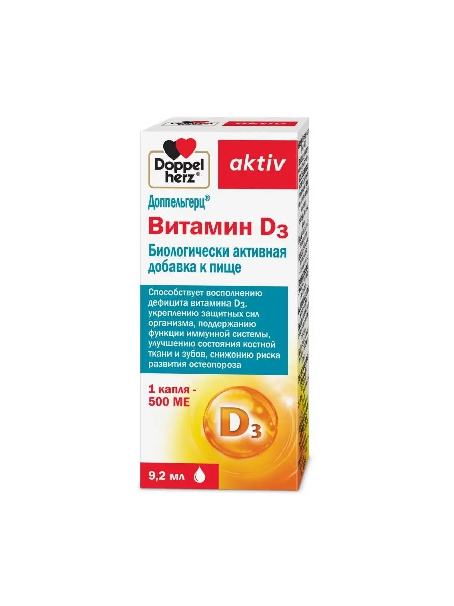 DOPPELHERZ ACTIVE VITAMIN D3 - Biologically active food supplement - Helps replenish vitamin D3 deficiency, strengthen the body's defenses, maintain immune system function, improve bone and teeth condition, reduce the risk of osteoporosis. 1 DROP CONTAINS: Vitamin D3 12.5 mcg (500 IU) 250*% of the recommended daily intake* does not exceed the upper tolerable intake level. Nutritional value: 1 drop contains 1.25 kJ/0.25 kcal, proteins 0 g, fats 0 g, carbohydrates 0 g. Indications: as a biologically active food supplement - an additional source of vitamin D3. Contraindications: individual intolerance to product components, pregnancy, breastfeeding. Directions: Adults, 1 drop daily with meals. Duration of administration - 1 month. If necessary, intake can be Repeat. Consult your doctor before use.