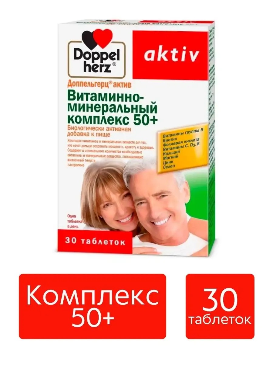 Doppel Herz Doppel Herz An additional source of selenium, zinc, magnesium, calcium, vitamins B1, B2, B6, B12, E, C, D3, folic acid, and biotin. Contraindications: individual intolerance to any of the product's components, pregnancy, and breastfeeding. A complex of vitamins and minerals for those who want to preserve youth, beauty, and health longer. Contains optimal amounts of essential vitamins and minerals that improve vitality and mood. Directions: Adults take 1 tablet once daily with meals. Duration of use: 1 month. After a break of 1 month, repeated administration is possible. Consult a doctor before use. Release form: tablets weighing 1765 mg. Shelf life: 3 years. Storage conditions: store in a dry place at a temperature not exceeding 25C. Keep out of the reach of children! Nutritional and energy value: 1 tablet contains 1 kJ / 1 kcal, proteins 0 g, fats 0 g, carbohydrates 0 g. Doppelherz aktiv Vitamin and mineral complex 50+