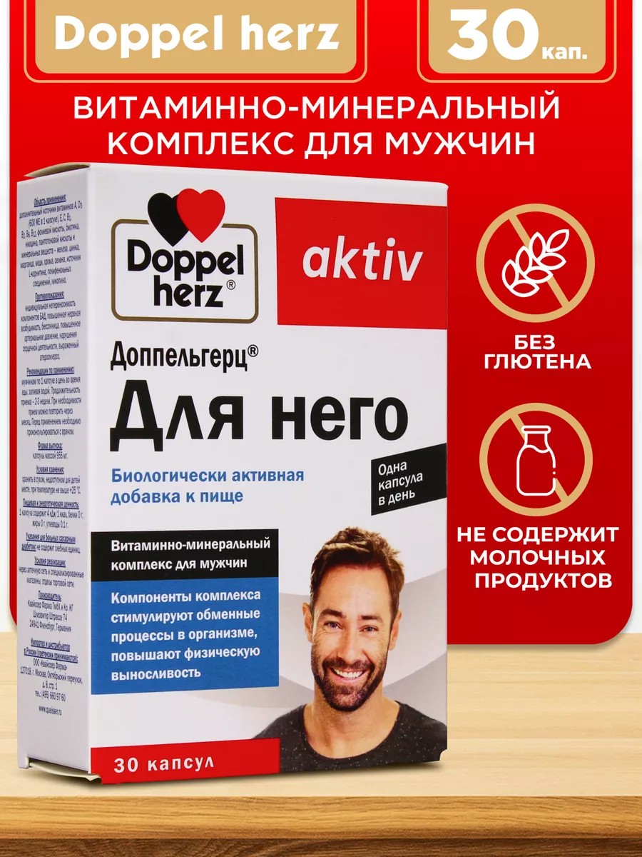 ДОППЕЛЬГЕРЦ АКТИВ ДЛЯ НЕГО - Витаминно-минеральный комплекс для мужчин, специально разработанный витаминно-минеральный комплекс для мужчин. Компоненты комплекса стимулируют обменные процессы в организме, повышают физическую выносливость и способствуют нормальной работе сердечно-сосудистой системы. Полезен для поддержания жизненного тонуса и сексуальной функции.