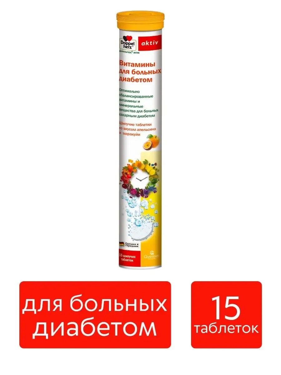 Doppel Herz Doppel Herz Vitamins are involved in all metabolic processes, increasing the body's resistance to adverse external factors, microorganisms, and viruses. Insufficient vitamin and mineral intake in patients with diabetes is a risk factor for serious complications, primarily retinopathy (damage to the retinal blood vessels) and polyneuropathy (damage to the kidney blood vessels). **Ingredients:** Citric acid, sodium carbonate, magnesium carbonate, sorbitol, inulin, ascorbic acid, DL-alpha-tocopherol acetate, tricalcium orthophosphate, starch, flavoring, sodium cyclamic acid, zinc gluconate, beet powder, nicotinamide, biotin, sodium saccharin (sweetener E 954), calcium-D-pantothenate (pantothenic acid), pyridoxine hydrochloride (vitamin B6), chromium-III-chloride (chromium), sodium selenate (selenium), thiamine hydrochloride (vitamin B1), sodium riboflavin-5-phosphate (vitamin B2), cyanocobalamin (vitamin B12), folic acid. Doppelherz aktiv Doppelherz aktiv vitamins for diabetics 15 pcs. effervescent tablets