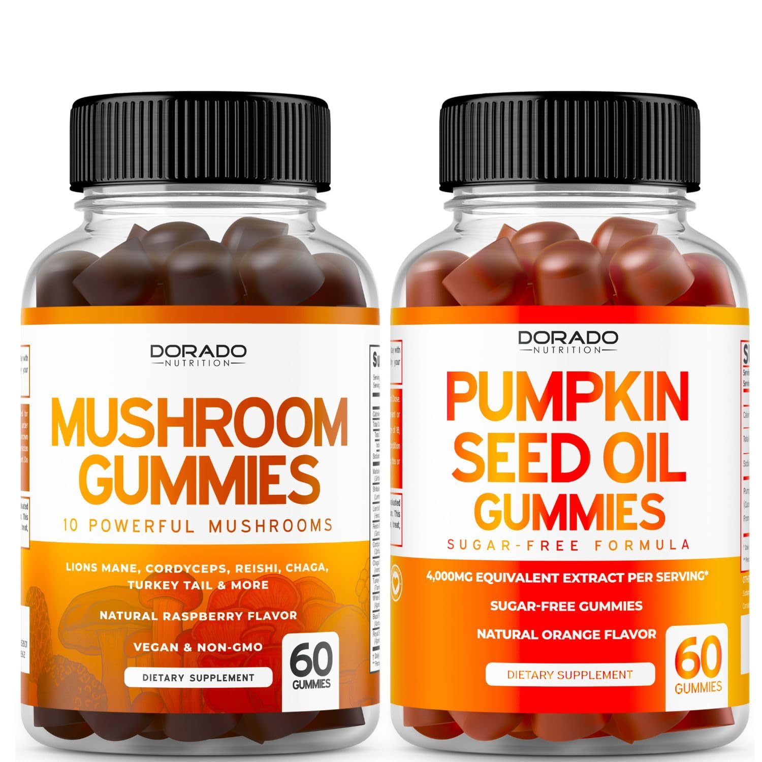 DORADO NUTRITION Mushroom Gummies (60 Count) 10 in 1 Supplement for Focus & Brain Support and Pumpkin Seed Oil Gummies (60 Count) Hair Growth and Bladder Control Supplement - Non GMO & USA Made