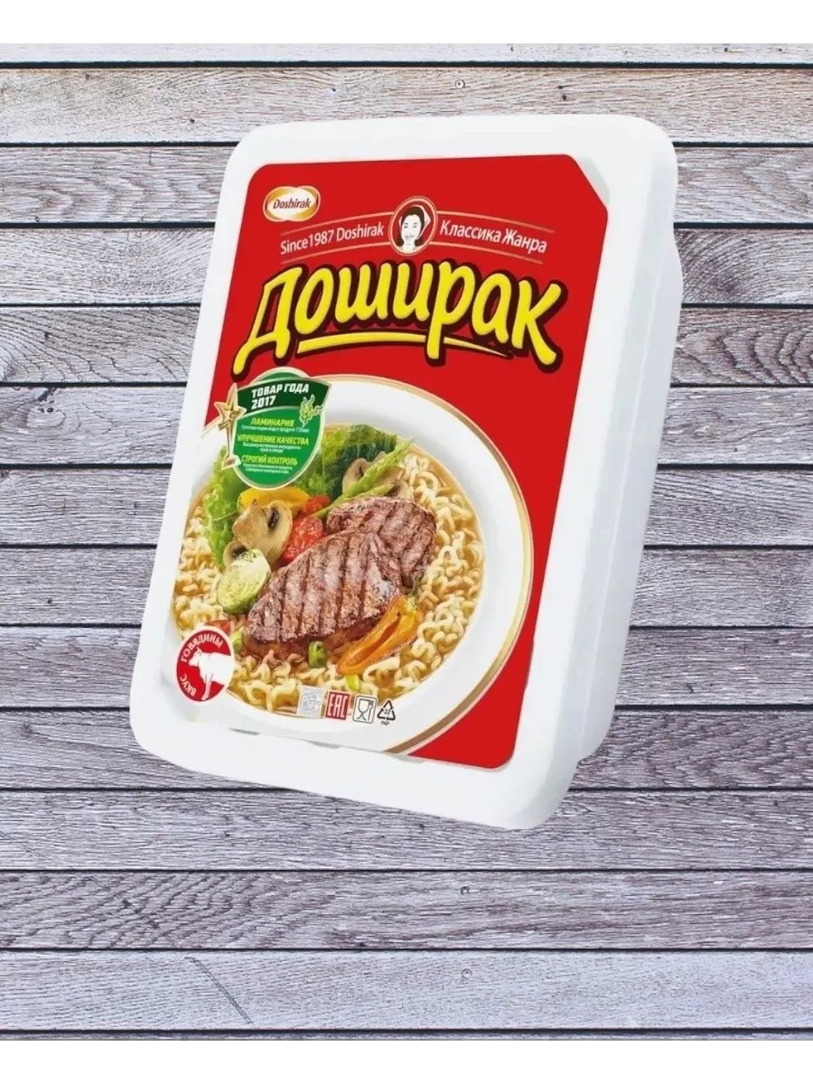 Доширак представляет собой всеми известную лапшу быстрого приготовления, хранящуюся в сухом виде в небольших брикетах. Продукт содержит глютен, сою и продукты её переработки, рыбный продукт. Может содержать следовые количества продуктов переработки молока.