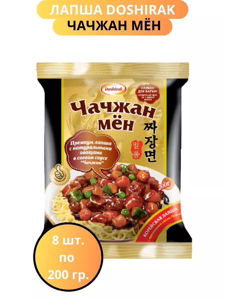 Лапша Корейская быстрого приготовления Чачжан мен (мён) от Доширак - это китайская еда полноценный обед с натуральным тушеным мясом и овощами. Люди уже много лет отдают свое предпочтение Доширак, это первое что приходит на ум когда слышишь "азиатская еда"! Продукты быстрого приготовления занимают первое место в меню занятого человека. Корейская еда - это настоящее искусство вкуса и культуры.