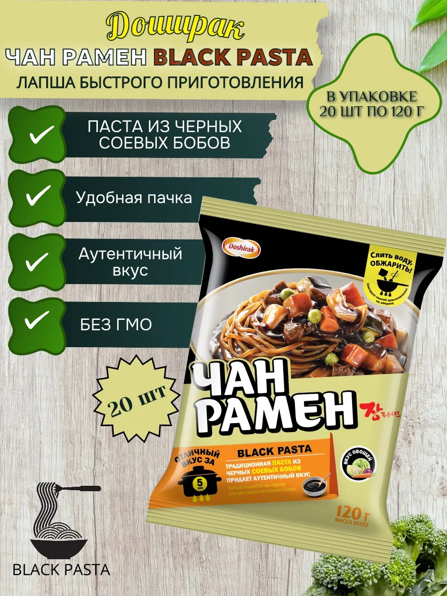 Доширак Чан Рамен — это популярное Корейское блюдо, которое отличается насыщенным вкусом и оригинальной текстурой. Лапша для варки Чан Рамен Black Pasta — отличный выбор для ценителей азиатской кухни и любителей быстрого приготовления пищи. В каждой коробке вы найдете набор из двадцати порций пасты, которая быстро готовится и подходит как для самостоятельного блюда, так и в качестве основы для разнообразных рецептов.