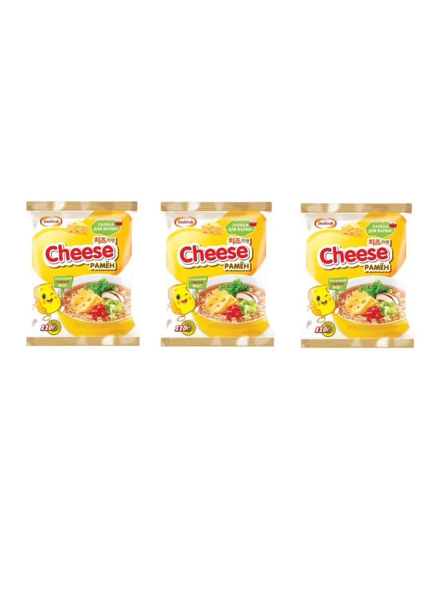Doshirak, Cheese Ramen Noodles, 110g, 3 Packs. Doshirak Cheese Ramen noodles are a mild dish with a sophisticated, mild flavor. The cheese seasoning is individually packaged. These noodles can be used as a first or second course. They're a great option for a simple and quick lunch or snack during the day. Cook the noodles before eating, then add all the ingredients provided. They quickly satisfy hunger and energize, giving you strength, and thanks to their healthy ingredients, they're suitable for everyone. Ingredients: Noodles: premium wheat flour, vegetable oil, thickener (acetylated starch), salt (extra edible salt, anti-caking agent E536), gluten, premix stabilizer (stabilizers: E501i, E412, E452i), Soy product (soy sauce powder, sugar, salt, yeast extract, fried onion). Broth seasoning: broth base (dry milk, cheese powder, plant-based cream substitute (corn syrup, vegetable oil, vegetable protein), black pepper), salt (extra edible salt, anti-caking agent E 536), flavor enhancer (E621), sugar. Cheese seasoning: cheese powder. Seasoning from dried vegetables: cabbage, carrots, onions. The product contains gluten, milk derivatives, soy, and traces of fish, crustacean, and mollusc derivatives.