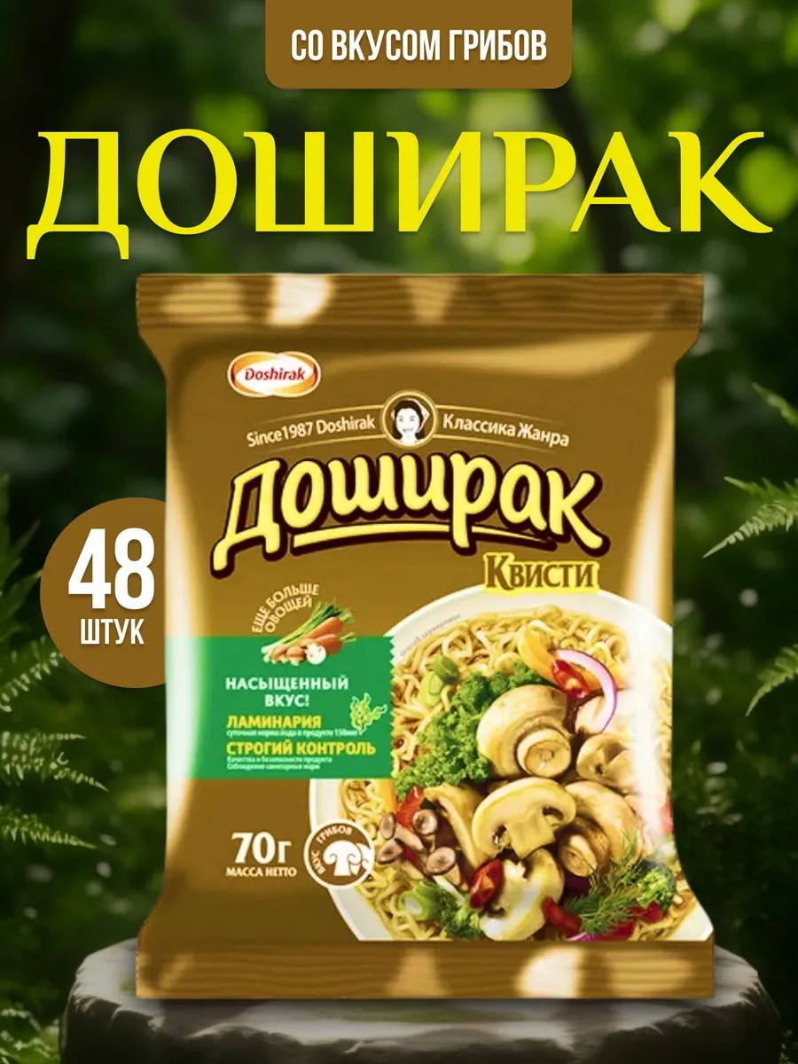 Doshirak Doshirak Kvisti Instant Noodles with Mushroom Flavor, 70g. Set includes 48 pcs. Price per set. Sometimes you don't have time for a full meal. For example, this applies to situations with a very busy workday. Doshirak instant noodles with a broth base (mushroom powder, soy sauce, red pepper, sesame powder, whey, garlic, black pepper, antioxidant (E330)) and seafood flavor will help you cope with hunger. They cook in minutes, and are delicious and appetizing. Doshirak noodles are sold in 70g vacuum packaging. They are made from high-quality and safe ingredients. Preparation: add seasoning to taste to the noodles, pour boiling water over them, cover with a lid, wait 3-4 minutes, and stir. The dish is ready to eat. Need a tasty dish to help satisfy your hunger during a busy workday? Doshirak instant noodles are perfect for these purposes. Buy them and enjoy the unique flavor. Instant food / Instant noodles / Spicy instant noodles