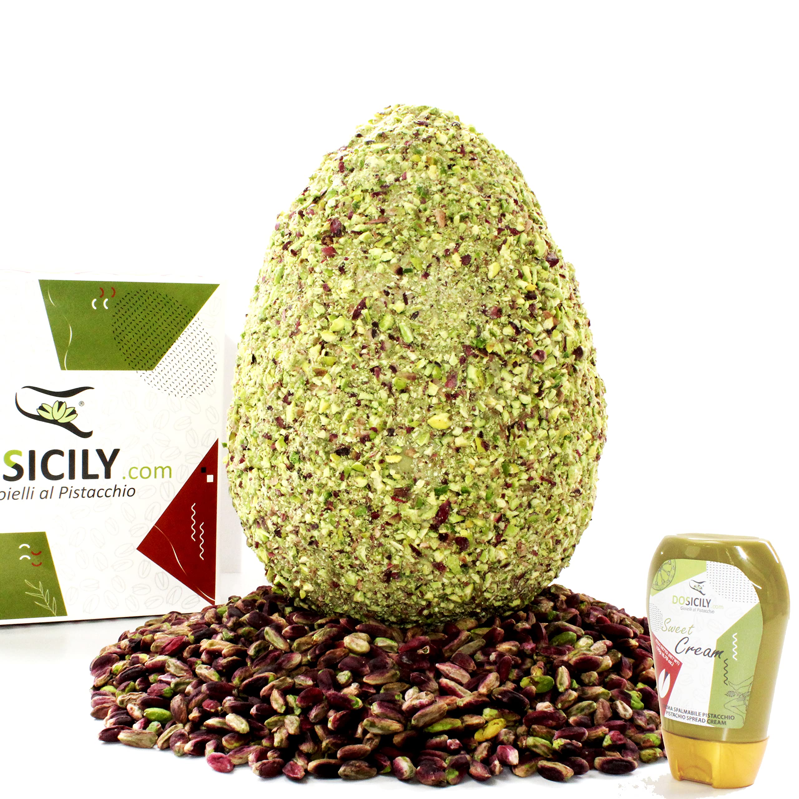 The quintessential Sicilian pistachio chocolate egg. Born in Sicily, in the heartland of pistachio country, considered the best in the world. The mastery of Sicilian Easter desserts, like the pistachio egg, is defined by exquisite taste and a touch of sweetness to be savored. This pistachio chocolate egg will delight even the most sophisticated and discerning palates who love pistachio. Ingredients: sugar, cocoa butter, whole milk powder, cocoa mass, emulsifier: SOYA lecithin, vanilla extract, EU pistachios, chlorophyllin, curcumin. Product name: white chocolate egg with pistachio paste and pistachio pieces. Net weight: 350g 700g 1.2kg. Pistachio origin: EU. May contain traces of other nuts. The highlighted ingredients may cause reactions in people with allergies or intolerances. Nutrition Facts: Average nutritional characteristics (per 100g) per 100g 100ml of product. Amount per 100g 100ml of product. Energy value: 575 kcal 2406 kJ. Fat: 38.17 g. Saturates. Saturated Fat 19.84 g Carbohydrates 49.68 g Of which sugars 48.57 g Protein 7.63 g Dietary fiber 1.32 g Sodium 0.18 g Shelf Life: 6 months Ingredients Optional Cream: pistachio (30 ), sugar, sunflower oil, vegetable fats (palm), skimmed milk powder, whey powder, emulsifier E322 sunflower lecithin, flavoring (vanillin). INGREDIENTS sugar, cocoa butter, whole milk powder, cocoa mass, emulsifier: soy lecithin, vanilla extract, pistachio, chlorophyllin, curcumin.DOSICILY.COM - "Gioielli al pistacchio - Œuf pistache avec granella 700 g crème pistache 190g - Chocolat blanc fin et Pâte pure de pistacheDESCRIPTION DU PRODUIT DESCRIPTION DU PRODUIT L'œuf par excellence toute sicilienne au chocolat de pistache grenel à la pistache. Né en Sicile sur le territoire local de la pistache appelé le meilleur au monde. La maîtrise des desserts de Pâques siciliens, comme l'œuf de pistache, définie par les bons goûts, un motif de douceur tout à déguster, cet œuf de chocolat à la pistache, ravira les palais les plus sophistiqués et exigeants qui aiment la pistache. Informations : Ingrédients : sucre, beurre de cacao, lait entier en poudre, pâte de cacao, émulsifiant : lécithine de SOIA, extrait de vanille, pistache UE, chlorophylline, curcumine. Désignation de vente : œuf de chocolat blanc avec pâte de pistache et grain de pistache. Poids net : 350 g 700 g 1,2 kg Origine pistache : UE. Peut contenir des traces d'autres fruits à coque. Les ingrédients mis en évidence peuvent provoquer des réactions chez les personnes allergiques ou intolérantes. Valeurs nutritionnelles Nutrition Facts : caractéristiques nutritionnelles (pour 100 g) moyennes pour 100 g 100 ml de produit Amount pour 100 g 100 ml de produit Valeur énergétique Energy value Kcal 575 KJ 2406 graisses Fat 38,17 g Acides gras saturés. i saturé FatAcids 19,84 g Glucides Carbohydrates 49,68 g Dont sucres Of which sugar 48,57 g Protéines Protein 7,63 g Fibres alimentaires Dietary fiber 1,32 g Sodium Sodium 0,18g Expiration SHELF Life : 6 mois 6 montants Ths Ingrédients Crème en option : pistache (30 ) UE, sucre, huile de tournesol, graisses végétales, (palme), lait écrémé en poudre, sérum de lait en poudre émulsifiant E322 léticine de tournesol, arôme (vanilline). INGRÉDIENTS sucre, beurre de cacao, lait entier en poudre, pâte de cacao, émulsifiant : lécithine de SOIA, extrait de vanille, pistache, chlorophylline, curcumine.