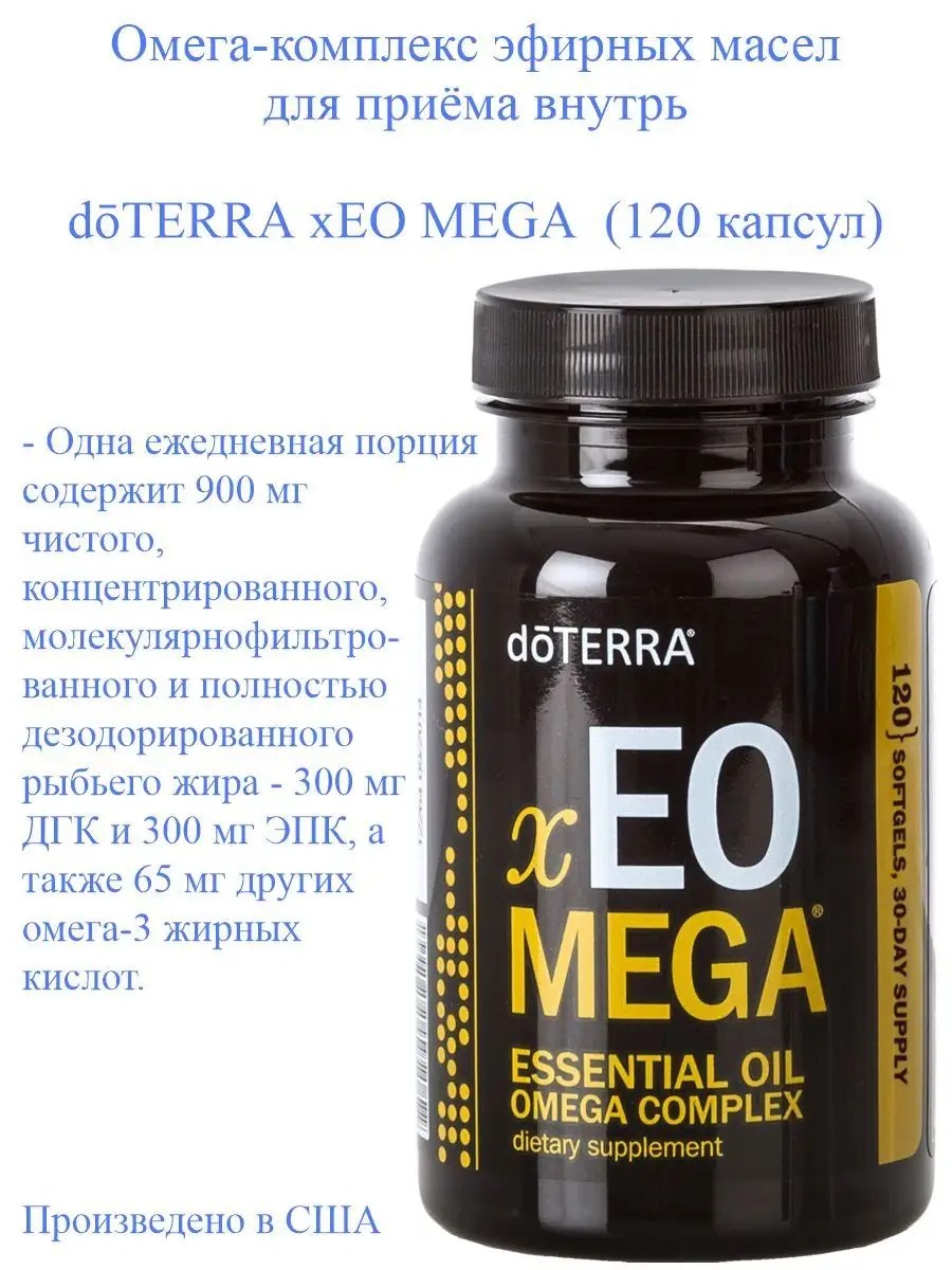 dōTERRA xEO Mega — уникальный комплекс, включающий сертифицированные чистые эфирные масла подтвержденного качества и уникальную смесь омега жирных кислот морского и растительного происхождения. Омега жирные кислоты помогают поддерживать здоровье суставов, мозга, сердечно-сосудистой и иммунной систем. Одна порция xEO Mega содержит 900 миллиграммов морских липидов (300 мг ЭПК, 300 мг ДГК и 60 мг других омега-3 кислот) и 250 мг жирных кислот растительного происхождения. В состав xEO Mega также входят 20 мкг натурального витамина D, 40 мкг натурального витамина Е и 1 мг астаксантина, мощного антиоксидантного каротиноида, получаемого из микроводорослей.xEO Mega изготавливается в форме вегетарианских капсул.