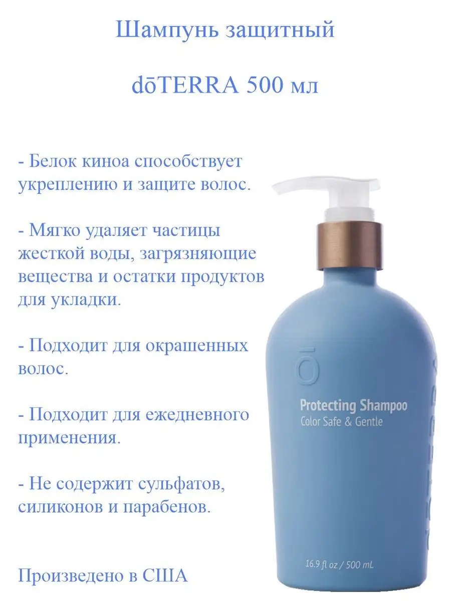 Мы подвергаем наши волосы многим испытаниям, поэтому неудивительно, что они могут потерять блеск, объем и стать безжизненными. Только представьте: лаки для волос, сухие шампуни, жесткая водопроводная вода или хлорированная вода в бассейне... Вот почему ваши волосы нуждаются в мягком и эффективном шампуне, который можно использовать каждый день. Защитный шампунь заботится о ваших волосах. Он очищает волосы и наполняет их силой, придает здоровый вид коже головы и восстанавливает блеск и объем волос. Мягкий защитный шампунь doTERRA подходит для окрашенных волос и для ежедневного применения. Он отлично очищает и убирает остатки других средств. В его состав входят чистые эфирные масла мяты перечной, эвкалипта, чайного дерева и мяты колосистой, а также белок киноа, способствующий укреплению и защите волос. В этом натуральном освежающем шампуне нет агрессивных веществ, в том числе сульфатов, силиконов и парабенов. В сочетании с ежедневным кондиционером doTERRA ваши волосы не будут нуждаться в дополнительном увлажнении и станут здоровыми, сильными и послушными.