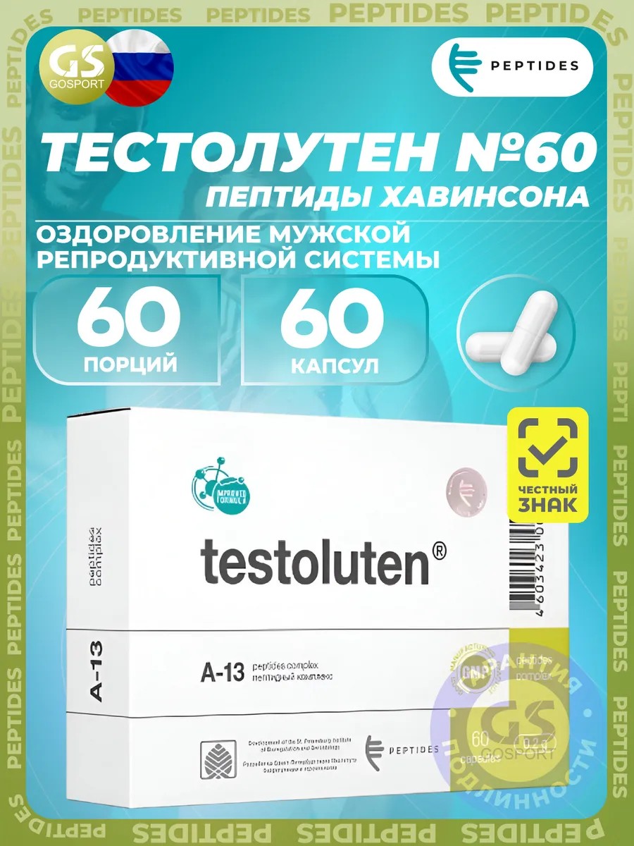 Годен до 28.02.2027. Тестолутен (Testoluten) 60 капсул. Натуральные пептиды семенников - ТестолутенКомплекс пептидных фракций, полученных из семенников молодых животных. Выделенные пептиды обладают избирательным действием на клетки мужской половой системы, повышают функциональную активность и усиливают подвижность сперматозоидов.При клиническом изучении установлена эффективность препарата "Тестолутен" для комплексного восстановления функции мужской репродуктивной системы, в том числе при гипофункции семенников, после воздействия ионизирующего излучения, при мужском бесплодии, после воздействия различных токсических факторов, негативно влияющих на мужскую половую систему, при снижении уровня тестостерона в крови, а также у мужчин старших возрастных групп для поддержания функции половой системы. Рекомендован: для повышения функциональной активности мужского организма для нормализации мужского гормонального статуса для усиления либидо для усиления эректильной функции для нормализации подвижности сперматозоидов Состав продуктаПептидный комплекс А-13 (пептиды семенников), носитель МКЦ; оболочка капсулы (гидроксипропилметилцеллюлоза, вода очищенная, каррагинан, ацетат калия), антислеживающий агент кальциевая соль стеариновой кислоты.Тестолутен лингвал: вода, пептидный комплекс А-13 (пептиды семенников).Суточная доза содержит: (2 капсулы), 20 мг пептидного комплекса А-13Инструкция по применению:Взрослым по 1-2 капсулы 1-2 раза в день во время еды. Продолжительность приема - 1 месяцТестолутен лингвал: взрослым принимать под язык по 5–6 капель (0,25–0,35 мл) за 10–15 мин до еды 3–4 раза в день. Продолжительность приема — 1 месяц. Рекомендуется проводить повторный прием через 3–6 месяцев.