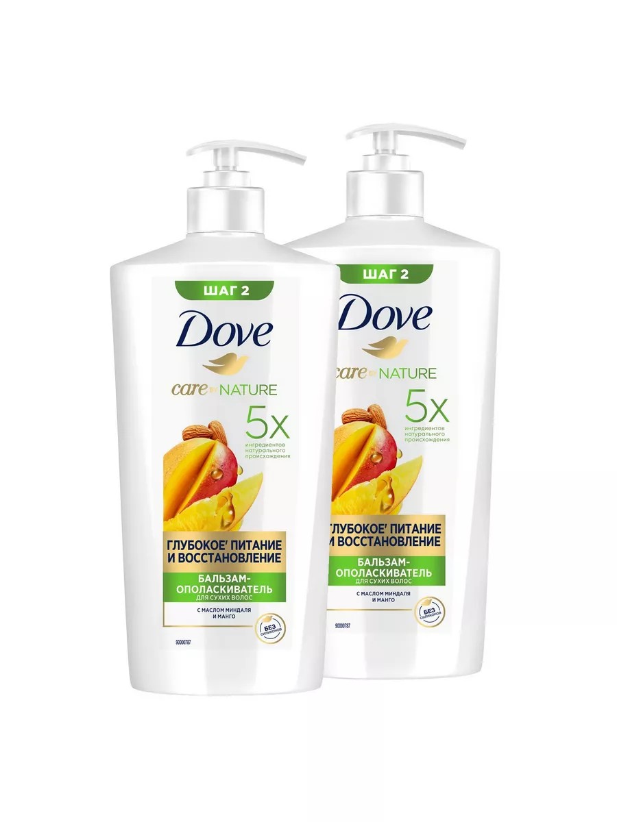 Doveбальзам-ополаскиватель глубокое питание и восстановление с манго 630 мл - 2шт. Сухие волосы нуждаются в качественном ежедневном очищении и уходе. Для восстанавливающего ухода за сухими и очень сухими волосами попробуйте сочную новинку от doveбальзам-ополаскиватель глубокое' питание и восстановление с манго. Только 100% натуральные ингредиенты, без силиконов и красителей. Ухаживающая питательная формула бальзама dove с манго содержит 5 ингредиентов натурального происхождения (масло миндаля, экстракт манго, глицерин, масло кокоса, авокадо), комплексно воздействует на волосы и кожу головы, питая и восстанавливая. Результат: бережное эффективное восстановление и натуральный уход!бальзам-ополаскиватель dove питает и восстанавливает даже очень сухие волосы без утяжеления. Невероятный сочный аромат манго подарит вам особое удовольствие. Мягкие и послушные волосы каждый день! Продукт представлен в объеме 630 мл, для удобства флакон оснащен помпой. Для наилучшего результата используйтебальзам-ополаскиватель dove каждый раз после мытья волос шампунем серии. 1-2 раза в неделю воспользуйтесь маской из серии глубокое питание и восстановление для интенсивного ухода. На вымытые влажные волосы нанесите несмываемый крем глубокое' питание и восстановление тонким слоем (от середины длины до кончиков или только на кончики).