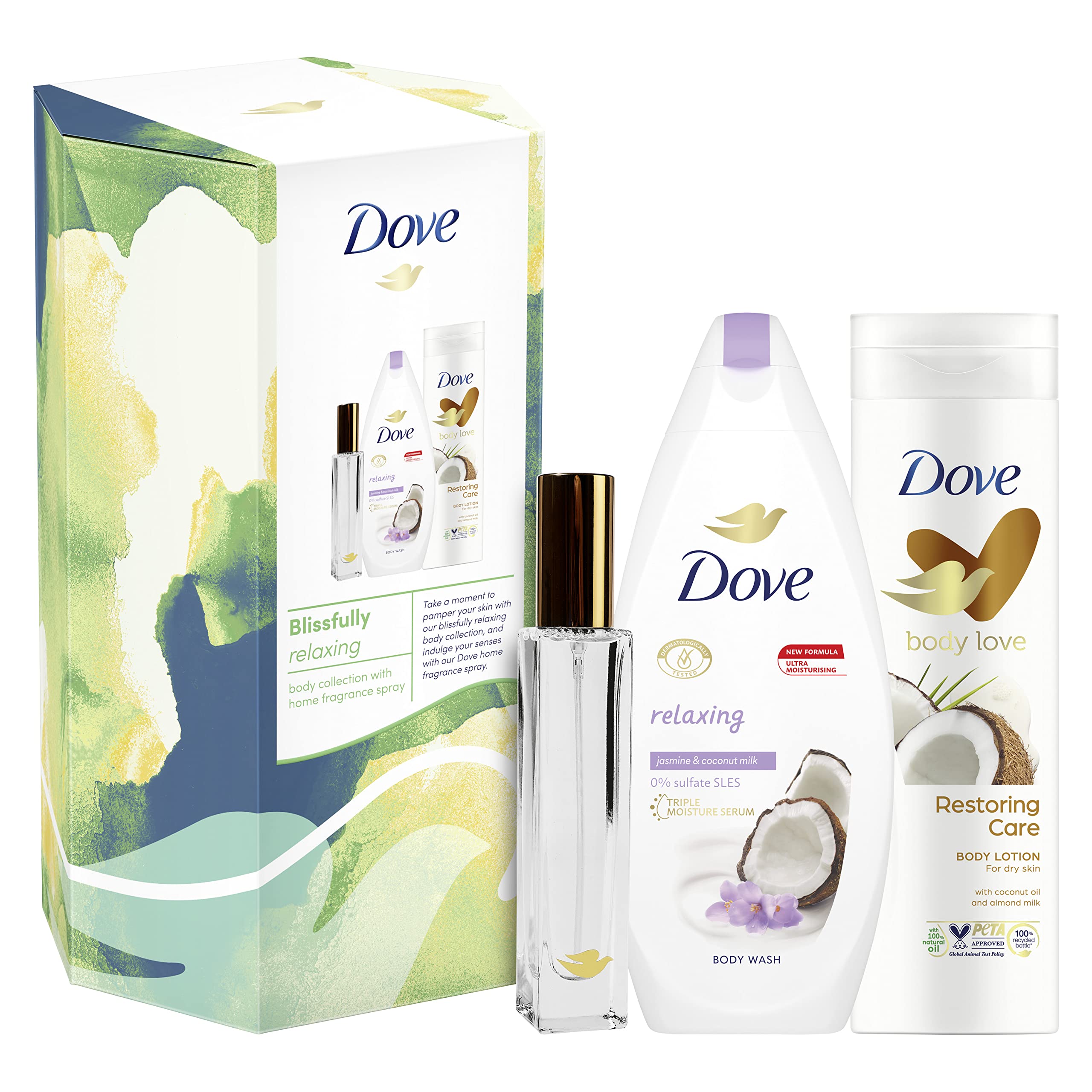 Know someone who’s into confidence-inspiring natural beauty in a big way? You’ve just found the perfect gifts for her. Dove believes that beauty is not defined by shape, size, or colour. It’s about feeling like the best version of yourself. Authentic. Unique. Real. That’s why this Blissfully Relaxing Body Collection Gift Set features a decadent home fragrance spray and two Dove products that are sure to indulge her senses, leaving her skin feeling restored and extra soft. Infused with the calming scent of jasmine petals and coconut milk, Dove Relaxing Body Wash 225 ml wraps her in a cloud of rich, creamy lather for a soothing sensory experience that will leave her feeling truly relaxed. Its ultra-moisturising, sulphate-SLES-?free formula is enriched with Triple Moisture Serum to provide instant softness and lasting nourishment for even the driest skin. Infused with coconut oil and almond milk, Dove Restoring Care Body Lotion 250 ml deeply* moisturises dry skin to leave it feeling beautifully soft and smooth. Its creamy scent will soothe her senses, helping her indulge in a restorative experience. Complete with a stunning home fragrance spray, this set of gifts for women will help turn her skincare routine into an immersive ritual for body, mind, and soul. Help her look and feel her best no matter the occasion with this collection of pampering gifts from Dove. *within the stratum corneum INGREDIENTS Dove Relaxing Body Wash 225ml INGREDIENTS: Aqua, Sodium Lauroyl Glycinate, Cocamidopropyl Betaine, Sodium Lauroyl Isethionate, Sodium Chloride, Lauric Acid, Glycerin, Parfum, Sodium Benzoate, Carbomer, Glycol Distearate, Sodium Hydroxide, PEG-150 Pentaerythrityl Tetrastearate, Stearic Acid, PPG-2 Hydroxyethyl Cocamide, Undecylenoyl Glycine, Capryloyl Glycine, Palmitic Acid, Sodium Isethionate, Tetrasodium EDTA, Glycol Stearate, Caprylic Acid, Capric Acid, Propylene Glycol, Hydroxystearic Acid, Citric Acid, Jasminum Officinale Flower Extract, Cocos Nucifera Fruit Extract, Alpha-Isomethyl Ionone, Benzyl Alcohol, Benzyl Salicylate, Hexyl Cinnamal, Limonene, Linalool, CI 17200, CI 19140. DOVE LOTION COCONUT 250ml INGREDIENTS: Aqua, Glycerin, Dimethicone, Stearic Acid, Caprylic/Capric Triglyceride, Glycol Stearate, PEG-100 Stearate, Petrolatum, Glyceryl Stearate, Caprylyl Glycol, Phenoxyethanol, Cetyl Alcohol, Parfum, Acrylates/C10-30 Alkyl Acrylate Crosspolymer, Triethanolamine, Disodium EDTA, Stearamide AMP, Carbomer, Cocos Nucifera Oil, Tocopheryl Acetate, Prunus Amygdalus Dulcis Seed Extract, Helianthus Annuus Seed Oil, PEG-40 Hydrogenated Castor Oil, Pentylene Glycol, Sine Adipe Lac, Propylene Glycol, Isomerized Linoleic Acid, Prunus Amygdalus Dulcis Oil, Citric Acid, Coumarin, CI 77891.Beautifully packaged in a ready-to-wrap gift box, this set of gifts for her makes the perfect stocking filler, Secret Santa, or all-year-round gift. This gift set comes complete with a stunning Dove Home Fragrance Spray that gives off a decadent scent to top off the home-pampering experience. Dove Restoring Care Body Lotion 250 ml is a rich moisturiser that leaves dry skin feeling restored and soothes the senses with a creamy coconut oil and almond milk scent. Dove Relaxing Jasmine Petals & Coconut Milk Body Wash 225 ml helps minimise skin dryness, giving her instantly softer, smoother skin after just one shower. These gifts for her are designed to turn her daily routine into an indulgent experience that will leave her feeling naturally beautiful, all day. Pamper your loved one with the Dove Blissfully Relaxing Body Collection Gift Set, which includes two full-size Dove products and a home fragrance spray.