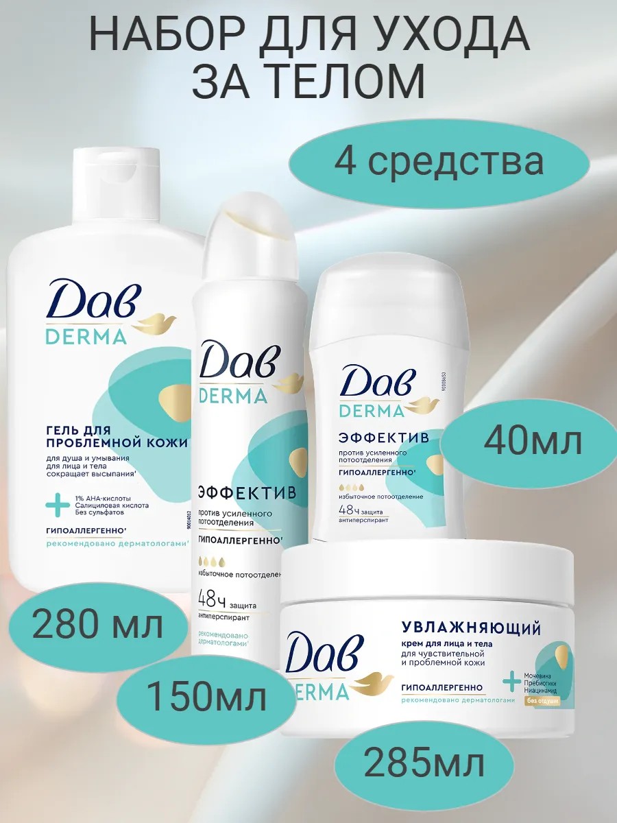 Dove Derma Hypoallergenic Shower and Face Wash for Problem Skin is a new anti-acne treatment based on a 1% AHA complex and salicylic acid. Suitable for problematic skin on the body and face, its gentle, soft texture creates a feeling of clean, smooth, and moisturized comfort immediately after the first use. The hypoallergenic formula with a neutral scent is safe for sensitive skin. This sulfate-free anti-acne body and face wash soothes the skin, combating acne and post-acne marks. The absence of sulfates (SLS, SLES) ensures a gentle effect without drying or tightening the skin. Moisturizing ingredients maintain the skin's natural moisture balance, leaving it soft and hydrated for 24 hours. The formula gently exfoliates dead skin cells without damaging them. Dove Derma Moisturizing Face and Body Cream is specially formulated for dry, sensitive, and problematic skin. This product will be your faithful companion in the fight against tightness and dryness, helping to keep skin soft and smooth for a long time. This product is suitable for all skin types, for both women and men, as well as for girls and teenagers aged 14 and up. It effectively cares for both women's and men's skin, helping to eliminate flaking and discomfort. The cream's unique formula provides deep hydration, restoration, and strengthening of the skin's protective functions. This hypoallergenic, fragrance-free product helps restore the skin's microbiome, reducing the negative impact of the environment. It contains urea (5%), prebiotics, and niacinamide (vitamin B3). These ingredients not only maintain optimal hydration levels but also protect the skin from dehydration after a shower, preventing dryness. Dove Derma hypoallergenic deodorants are an effective new product that will become an indispensable aid in underarm skin care. This product is specially designed for women, young women, and adolescent girls aged 14 and up who value comfort and freshness throughout the day. This product effectively protects against sweat odor and controls sweat secretion, giving you confidence in any situation. The hypoallergenic deodorant formula includes gentle yet active ingredients that combat excess moisture and odor. One of the main advantages of this product is its alcohol-free formula. This women's solid deodorant stick for sweat and odor, enriched with niacinamide and minerals, helps protect underarm skin from excessive sweating for 48 hours without causing irritation or stickiness.
