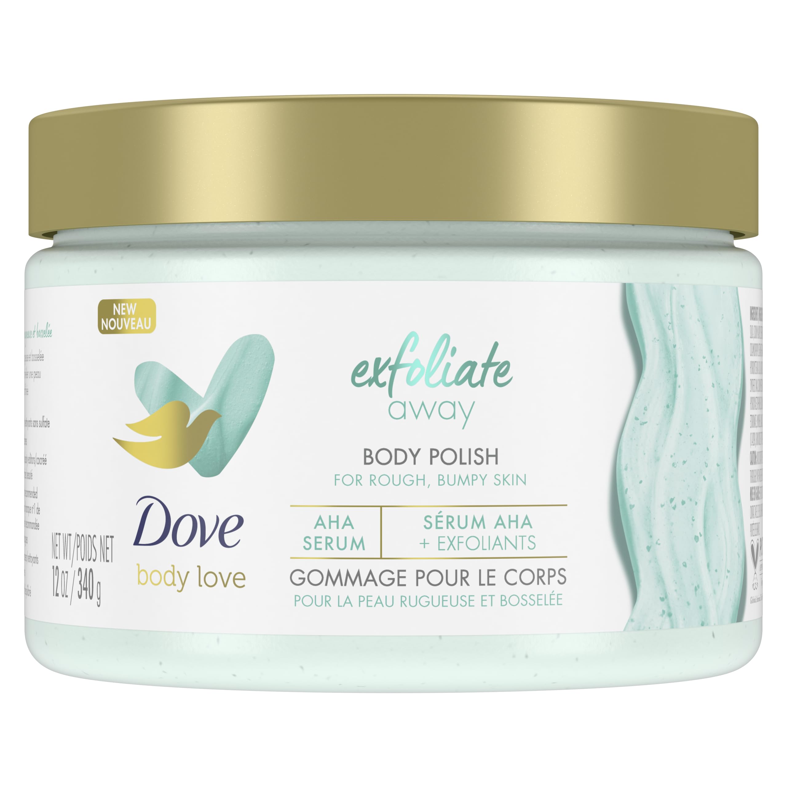 Ready to shower your body with love? Dove Exfoliate Away Body Scrub exfoliates and refines your skin in the shower to reveal silky, soft skin. Made with the face care ingredients you love in your daily face care regimen, just wait and see what they can do for your body. Formulated with 10x moisture boost , the hydrating exfoliating body scrub formula, made with AHA Serum Exfoliants, buffs away dead skin cells and refines and preps the skin barrier. This body scrub for rough, bumpy skin gently exfoliates and infuses moisture to reveal silky smooth skin. A paraben and sulfate free cleanser, it's also pH balanced and microbiome gentle, formulated with plant-based cleansers, and packaged in 100 recycled plastic jars. Dove Exfoliate Away Body Scrub is vegan and Dove is globally approved by PETA. How To Use: Apply a generous amount of Dove Exfoliate Away Body Scrub into your palms. Then massage this exfoliating scrub on skin in the shower and leave on for one minute to infuse moisture, then rinse, before following with the Dove Body Love Cleanser to lock in moisture. Try switching your regular body scrub for serum-infused body scrubs or a scrub with AHAs. Dove believes that no young person should be held back from reaching their full potential. Since 2004, we've been building self-esteem and confidence in young people – and by 2030, we'll have helped ¼ billion through our educational programs and resources. vs. the next leading body wash.BACKED BY EXPERTS: This body scrub is made by the 1 dermatologist recommended body wash brand and co-created with beauty editors. CLEAN INGREDIENTS: Our body scrub is also vegan and Dove is globally approved by PETA. Our jar is made with 100 recycled plastic. HOW TO USE: Massage a generous amount of this body scrub on skin and leave on for one minute to infuse moisture, then rinse, before following with the Dove Body Love Cleanser to lock in moisture. FOR ROUGH, BUMPY SKIN: This body scrub for rough, bumpy skin gently exfoliates while infusing moisture to leave the skin barrier beautifully refined and illuminated. MADE WITH FACE CARE INGREDIENTS: The hydrating exfoliating body scrub formula, made with AHA Serum Exfoliants, buffs away dead skin cells and refines and preps the skin barrier. EXFOLIATE AWAY: Dove Exfoliate Away Body Scrub exfoliates and refines your skin in the shower to reveal silky soft skin.