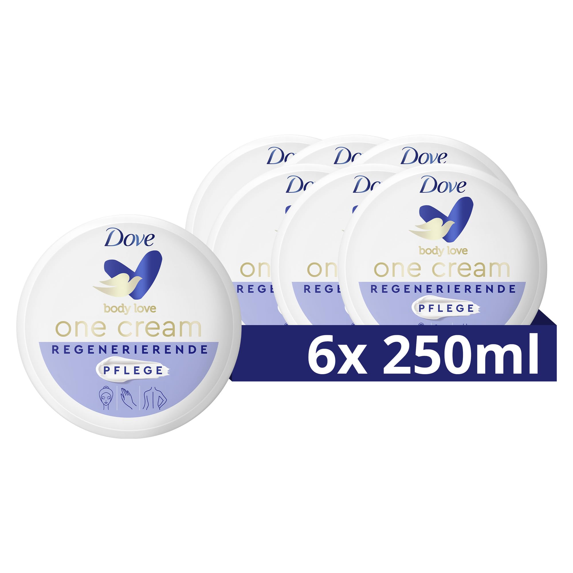 Dove Body Love One Cream Registered Care is a light, yet deep -effective nourishing formula that quickly absorbs and cares you from head to toe.This pampering cream with Ceramide structure Serum is suitable for dry skin and was specially developed for the face, hands and body of body and face-care experts.Together with the nourishing shea butter, the crucible conjures up a type of caress, smooth skin - for care, love and moments of wellbeing from the face to the fingertips.Thanks to the light, fast -moving formula and the diverse possible uses, the Body Cream is perfect for daily routine, even if it has to be quick.The airy texture melts directly with the facial skin when applied, which feels so tender and well -kept.The resultWell -kept skin and 48 hours of moisturizing with every application.Dove is certified as PETA-APPROVED by the leading international animal protection organization PETA (People for the Ethical Treatment of Animals)-in recognition of the brand's global engagement.At Dove we believe in Body Love.With the right care, we can give our body a little love at any time, regardless of how we feel in our skin.Dove supports women in developing the full potential of their individual beauty by developing products that respond to the personal needs of skin and hair.Because we believe that only those who feel beautiful and well in their skin through the right care can also radiate this. Address manufacturer importer 455, 3013 AL, NLThe Dove One Cream is dermatologically tested.The body cream for dry skin moves in in seconds and donates moisture for a long-lasting hydro boost for 48 hours.The Dove Body Cream maintains deeply thanks to the Ceramide structure Serum for a sustainably strengthened skin barrier and softer, smoother skin.The Dove One Cream is the first care for the entire Skin-Care routine-light enough for the care of the face, rich enough for the whole body and dry hands.The Dove Body Love One Cream regenerating care for face, hands and body is suitable for dry skin.Dove Body Love One Cream Regenerierende Pflege ist eine leichte und dennoch tiefenwirksam pflegende Formel, die schnell einzieht und dich von Kopf bis Fuß pflegt. Diese verwöhnende Creme mit Ceramide Aufbau Serum eignet sich für trockene Haut und wurde speziell für Gesicht, Hände und Körper von Body- und Face-Care-Expert innen entwickelt. Zusammen mit der nährenden Sheabutter zaubert der Tiegel ein streichelzartes, geschmeidiges Hautgefühl – für Pflege, Liebe und Wohlfühlmomente vom Gesicht bis in die Fingerspitzen. Dank der leichten, schnell einziehenden Formel und der vielfältigen Anwendungsmöglichkeiten ist die Body Cream perfekt für die tägliche Routine, auch wenn es mal schnell gehen muss. Die luftige Textur verschmilzt beim Auftragen direkt mit der Gesichtshaut, die sich so zart und gepflegt anfühlt. Das ErgebnisGepflegte Haut und 48 Stunden Feuchtigkeitspflege mit jeder Anwendung. Dove ist durch die führende internationale Tierschutzorganisation PETA (People for the Ethical Treatment of Animals) als PETA-approved zertifiziert – in Anerkennung des globalen Engagements der Marke. Wir bei Dove glauben an Body Love. Unserem Körper können wir mit der richtigen Pflege jederzeit ein wenig Liebe schenken, unabhängig davon, wie wir uns in unserer Haut fühlen. Dove unterstützt Frauen dabei, das volle Potenzial ihrer individuellen Schönheit zu entfalten, indem wir Produkte entwickeln, die auf die persönlichen Bedürfnisse der Haut und Haare eingehen. Denn wir glauben, nur wer sich durch die richtige Pflege schön und wohl in seiner Haut fühlt, kann dies auch ausstrahlen. ANSCHRIFT HERSTELLER IMPORTEUR 455, 3013 AL, NLDie Dove One Cream ist dermatologisch getestet. Die Körpercreme für trockene Haut zieht in Sekunden ein und spendet 48 Stunden lang Feuchtigkeit für einen lang anhaltenden Hydro-Boost. Die Dove Body Cream pflegt tiefenwirksam dank Ceramide Aufbau Serum für eine nachhaltig gestärkte Hautbarriere und weichere, geschmeidigere Haut. Die Dove One Cream ist die erste Pflege für die gesamte Skin-Care-Routine – leicht genug für die Pflege des Gesichts, reichhaltig genug für den ganzen Körper und trockene Hände. Die Dove Body Love One Cream Regenerierende Pflege für Gesicht, Hände und Körper eignet sich für trockene Haut.Dove Body Love One Cream Regenerierende Pflege Body Cream für Gesicht, Hände und Körper für trockene Haut 6 x 250 ml