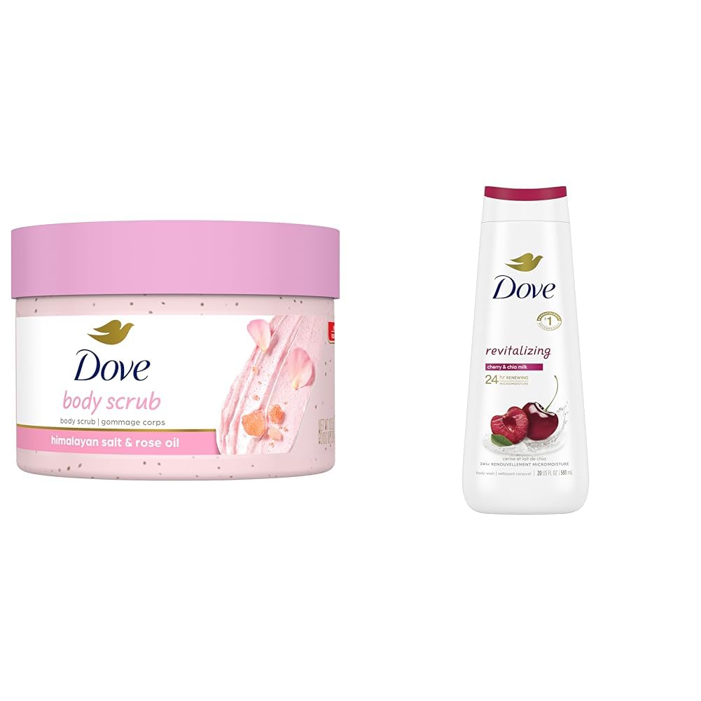 Product 2: FOR SOFT, SMOOTH SKIN: Our nourishing body wash, formulated with millions of MicroMoisture droplets that absorb deeply, leaves skin soft as silk. Product 2: 24HR RENEWING MICROMOISTURE: Dove Revitalizing Cherry & Chia Milk Body Wash gently cleanses and hydrates the skin, leaving it renewed and healthy-looking for 24 hours. Product 1: INDULGENT FRAGRANCE - This body scrub is made with sweet and fresh roses, evoking a sense of serenity. Product 1: REMOVES DULL DRY SKIN - When used as a body scrub, Dove exfoliating body scrub gently removes dead skin cells to reveal a new layer of beautiful, radiant skin. Product 1: MOISTURE RICH FORMULA - Dove Body Scrub is formulated with our ¼ moisturizing cream for instant softness. Product 1: MODERATE EXFOLIATION - Dove Himalayan Salt & Rose Oil Body Scrub nourishes and restore's skin's natural nutrients as it exfoliates.