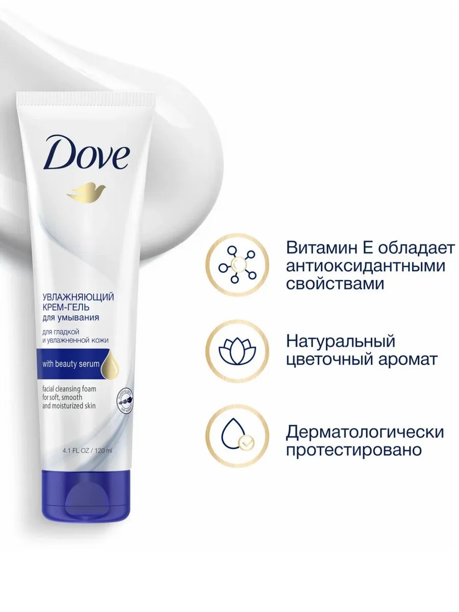 DOVE Крем-гель для умывания «Увлажняющий» для комбинированной кожи для бережного очищения лица, которое помогает сохранить баланс увлажненности кожи и сделать её мягкой и гладкой после умывания.