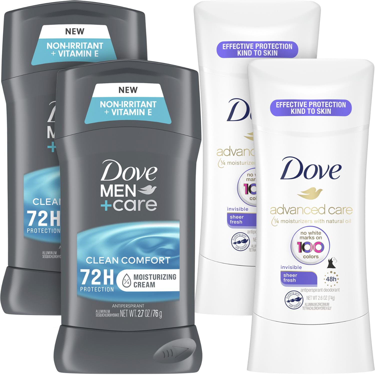 THOUGHTFULLY MADE SKINCARE PRODUCTS: Everything we make at Dove is PETA-approved, meaning we do not test on animals. ANTIPERSPIRANT DEODORANT FOR MEN AND WOMEN: Dove antiperspirant deodorants are designed to deliver up to 48 hours of effective protection. GENTLE ANTIPERSPIRANT DEODORANT: Since these full-size deodorant sticks are perfect for home and travel, feel free to use them whenever you need a non-irritating formula. ANTIPERSPIRANT FOR WOMEN & MEN: Our strong deodorants for women and men protect and comfort your skin thanks to the Dove antiperspirant deodorant formulas made with moisturizing sunflower oil, a rich source of Vitamin E. DOVE MEN+CARE & ADVANCED CARE FOR WOMEN: This convenient set includes two Clean Comfort deodorants for men and two Sheer Fresh deodorants for women, each providing the lasting protection your household needs to feel confident throughout the day.