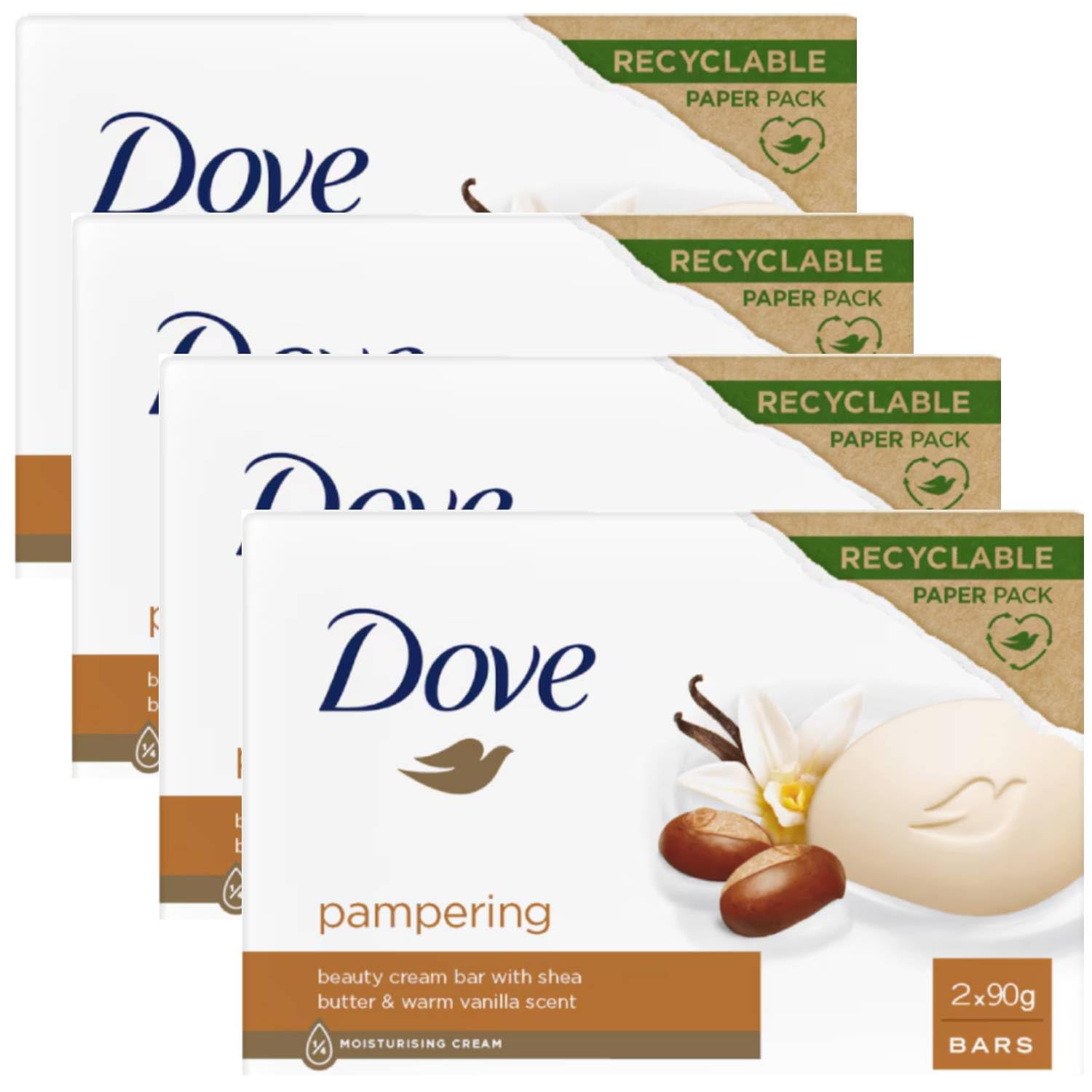Discover the Dove Beauty Cream Bar line with solid soaps that offer gentle cleansing and deep hydration. Each soap is enriched with Dove's exclusive ¼ moisturizing cream formula, which leaves skin soft, silky, and nourished without drying it out. Thanks to their gentle formula, they are also suitable for even the most sensitive skin, transforming every cleansing moment into a pampering experience. Available varieties: Dove Beauty Cream Bar Pink: a soft and delicate fragrance for a fresh and romantic experience. Dove Beauty Cream Bar Vanilla Shea Butter: a luxurious, enveloping scent that caresses the skin, enriched with shea butter for extra hydration. Dove Beauty Cream Bar Cucumber Green Tea: a fresh and rejuvenating fragrance that provides a feeling of freshness and cleanliness. Dove Beauty Cream Bar Original: Dove's classic fresh and clean fragrance, ideal for gentle daily hydration. Dove Beauty Cream Bar Pomegranate: a fruity and refreshing fragrance that invigorates the skin, leaving it soft and radiant. Key features: Pack of 2 x 90g for extended use. Formula enriched with ¼ moisturizing cream for soft, hydrated skin. Suitable for all skin types, even sensitive. Fresh, enveloping fragrances that last. Perfect for everyday use, whether in the bathroom or elsewhere. Directions for use: Massage the soap onto wet skin until a soft lather forms. Rinse thoroughly for clean, soft, and fresh skin. INGREDIENTS Moisturizing Cream SAFETY WARNING For external use only See moreDove Beauty Cream Bar with Cucumber Green Tea: A fresh and invigorating fragrance that leaves you feeling clean and refreshed. Dove Beauty Cream Bar Vanilla Shea Butter: A luxurious, enveloping scent that caresses the skin, enriched with shea butter for extra hydration. Dove Beauty Cream Bar Pink: A soft and delicate fragrance for a fresh and romantic experience. Thanks to their gentle formula, they are also suitable for even the most sensitive skin, transforming every cleansing moment into a truly pampering experience. Each bar is enriched with Dove's exclusive ¼ moisturizing cream formula, which leaves skin soft, silky, and nourished without drying it out. Discover the Dove Beauty Cream Bar line with solid soaps that offer gentle cleansing and deep hydration.Dove Beauty Cream Bar Savon solide Divers parfums 2 x 90 g (4 unités, vanille et karité)DESCRIPTION DU PRODUIT DESCRIPTION DU PRODUIT Découvrez la ligne de Dove Beauty Cream Bar avec des savons solides qui offrent un nettoyage en douceur et une hydratation profonde. Chaque savon est enrichi avec la formule exclusive Dove ¼ de crème hydratante, qui laisse la peau douce, soyeuse et nourrie, sans la sécher. Grâce à leur formule délicate, elles sont également adaptées pour les peaux les plus sensibles, transformant chaque moment de nettoyage en un véritable câlin. Variantes disponibles : Dove Beauty Cream Bar Pink : une fragrance douce et délicate pour une expérience fraîche et romantique. Dove Beauty Cream Bar à la vanille et au beurre de karité : un parfum enveloppant et luxueux qui câlin la peau, enrichi en beurre de karité pour une hydratation supplémentaire. Dove Beauty Cream Bar avec concombre et thé vert : une fragrance fraîche et rajeunissante qui procure une sensation de fraîcheur et de nettoyage. Dove Beauty Cream Bar – Original : la fragrance classique de Dove, fraîche et propre, idéale pour une hydratation quotidienne délicate. Dove Beauty Cream Bar avec grenade : une fragrance fruitée et rafraîchissante qui apporte vitalité à la peau, la rendant douce et lumineuse. Caractéristiques principales : lot de 2 x 90 g pour une longue durée de vie. Formule enrichie en ¼ de crème hydratante pour une peau douce et hydratée. Convient à tous les types de peau, même les plus sensibles. Des parfums frais et enveloppants qui durent dans le temps. Parfait pour un usage quotidien, que ce soit dans la salle de bain ou Mode d'emploi : masser le savon sur la peau humide jusqu'à obtenir une mousse douce. Rincer abondamment pour une peau propre, douce et fraîche. INGRÉDIENTS Crème hydratante AVERTISSEMENT DE SÉCURITÉ Usage extérieur uniquement Voir plusDove Beauty Cream Bar avec concombre et thé vert : une fragrance fraîche et revigorante qui procure une sensation de fraîcheur et de propreté. Dove Beauty Cream Bar Vanille et Beurre de Karité : Un parfum enveloppant et luxueux qui câlin la peau, enrichi en beurre de karité pour une hydratation supplémentaire. Dove Beauty Cream Bar Pink : une fragrance douce et délicate pour une expérience fraîche et romantique. Grâce à leur formule délicate, elles sont également adaptées pour les peaux les plus sensibles, transformant chaque moment de nettoyage en un véritable câlin. Chaque savon est enrichi avec la formule exclusive Dove ¼ de crème hydratante, qui laisse la peau douce, soyeuse et nourrie, sans la sécher. Découvrez la ligne de Dove Beauty Cream Bar avec des savons solides qui offrent un nettoyage en douceur et une hydratation profonde.