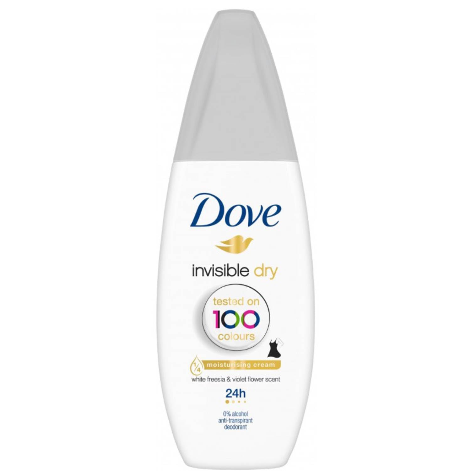 Dove Invisible Dry Deodorant offers reliable protection without compromise, thanks to its stain-resistant formula designed to protect both you and your clothes. This antiperspirant deodorant is clinically tested to leave no residue on over 100 colors, keeping your clothes looking pristine. Enriched with ¼ moisturizing cream, it nourishes and protects delicate underarm skin, leaving it soft and smooth even after hair removal. Stain-resistant formula: protects your clothes without leaving white marks or yellow stains, while maintaining vibrant, brilliant colors. Long-lasting antiperspirant protection: ensures freshness and protection for 48 hours, helping to control perspiration and odor throughout the day. Alcohol-free: ideal for sensitive skin, the alcohol-free formula reduces the risk of irritation and dryness, ensuring long-lasting comfort. Enriched with ¼ moisturizing cream: This special addition nourishes the skin and helps prevent dryness and irritation, leaving underarms smooth and soft. Fresh and delicate fragrance: A light, floral scent with notes of freesia and violet flower, providing a feeling of cleanliness and freshness all day long. Directions: Shake well before use. Apply directly to clean, dry underarms from a distance of 15 cm. Size: 75 ml INGREDIENTS Freesia Violet Flower Scent DIRECTIONS Shake well before use. Apply directly to clean, dry underarms from a distance of 15 cm. SAFETY WARNING For external use only. See moreAlcohol-free: Ideal for sensitive skin, the alcohol-free formula reduces the risk of irritation and dryness, ensuring long-lasting comfort. Long-lasting antiperspirant protection: Guarantees freshness and protection for 48 hours, helping to control perspiration and odor throughout the day. Stain-resistant formula: Protects your clothes without leaving white marks or yellow stains, while keeping colors bright and vibrant. Enriched with ¼ moisturizing cream, it nourishes and protects delicate underarm skin, leaving it soft and smooth even after hair removal. This antiperspirant deodorant is clinically tested to leave no residue on over 100 colors, keeping your clothes looking pristine. Dove Invisible Dry Deodorant offers reliable protection without compromise, thanks to its stain-resistant formula, designed to protect both you and your clothes.Dove Déodorant Invisible Dry Vapo No Gas Unisexe 24H 75 Ml (1)DESCRIPTION DU PRODUIT DESCRIPTION DU PRODUIT Le Dove Invisible Dry Déodorant vous offre une protection sûre sans compromis, grâce à sa formule anti-taches, conçue pour vous protéger aussi bien vous que vos vêtements. Ce déodorant anti-transpirant est cliniquement testé pour ne pas laisser de résidus sur plus de 100 couleurs, gardant vos vêtements impeccables. Enrichi en ¼ de crème hydratante, nourrit et protège la peau délicate des aisselles, la rendant douce et lisse même après l'épilation. Formule anti-taches : protège vos vêtements sans laisser de traces blanches ou de taches jaunes, tout en conservant les couleurs vives et brillantes. Protection anti-transpirante longue durée : garantit fraîcheur et protection pendant 48 heures, aidant à contrôler la transpiration et les odeurs tout au long de la journée. Sans alcool : idéal pour les peaux sensibles, la formule sans alcool réduit le risque d'irritation et de sécheresse, assurant un confort à long terme. Enrichi en ¼ de crème hydratante : cet ajout spécial nourrit la peau et aide à prévenir le dessèchement et les irritations, laissant les aisselles lisses et douces. Parfum frais et délicat : une fragrance légère et florale avec des notes de freesia et de fleur de violette, qui donne une sensation de propreté et de fraîcheur tout au long de la journée. Mode d'emploi : bien agiter avant utilisation. Appliquer directement sur les aisselles propres et sèches à une distance de 15 cm. Format : 75 ml INGRÉDIENTS Fresia Violet Flower Scent MODE D'EMPLOI Bien agiter avant utilisation. Appliquer directement sur les aisselles propres et sèches à une distance de 15 cm. AVERTISSEMENT DE SÉCURITÉ Usage extérieur uniquement. Voir plusSans alcool : idéal pour les peaux sensibles, la formule sans alcool réduit le risque d'irritation et de sécheresse, assurant un confort à long terme. Protection anti-transpirante longue durée : garantit fraîcheur et protection pendant 48 heures, aidant à contrôler la transpiration et les odeurs tout au long de la journée. Formule anti-taches : protège vos vêtements sans laisser de traces blanches ou de taches jaunes, tout en conservant les couleurs vives et brillantes. Enrichi en ¼ de crème hydratante, nourrit et protège la peau délicate des aisselles, la rendant douce et lisse même après l'épilation. Ce déodorant anti-transpirant est cliniquement testé pour ne pas laisser de résidus sur plus de 100 couleurs, gardant vos vêtements impeccables. Le Dove Invisible Dry Déodorant vous offre une protection sûre sans compromis, grâce à sa formule anti-taches, conçue pour vous protéger aussi bien vous que vos vêtements.