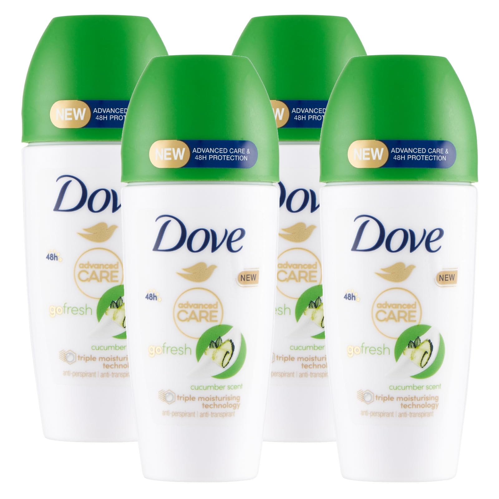 Dove Déodorant Go Fresh Roll-On Concombre et Thé Vert 48h 0 Alcool Anti-transpirant Hydratant Parfum Frais - 4 Flacons de 50 ml 50 ml (Confezione da 4)