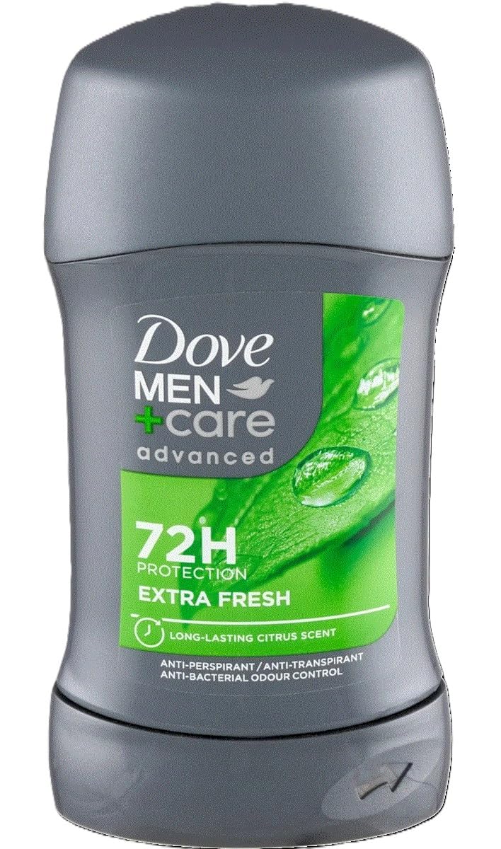 Dove Men Care Advanced Antiperspirant Deodorant, Extra Fresh, 50ml. Extend your feeling of freshness with a fresh-scented men's deodorant, like the Dove Men Care Extra Fresh Antiperspirant Stick. This deodorant stick provides up to 72 hours of protection against perspiration and body odor. It leaves a subtle fragrance on the skin that lasts all day. Moisturizing Technology 1 4 protects your skin from irritation. Its alcohol-free formula effectively fights perspiration while nourishing your skin. SAFETY WARNING none