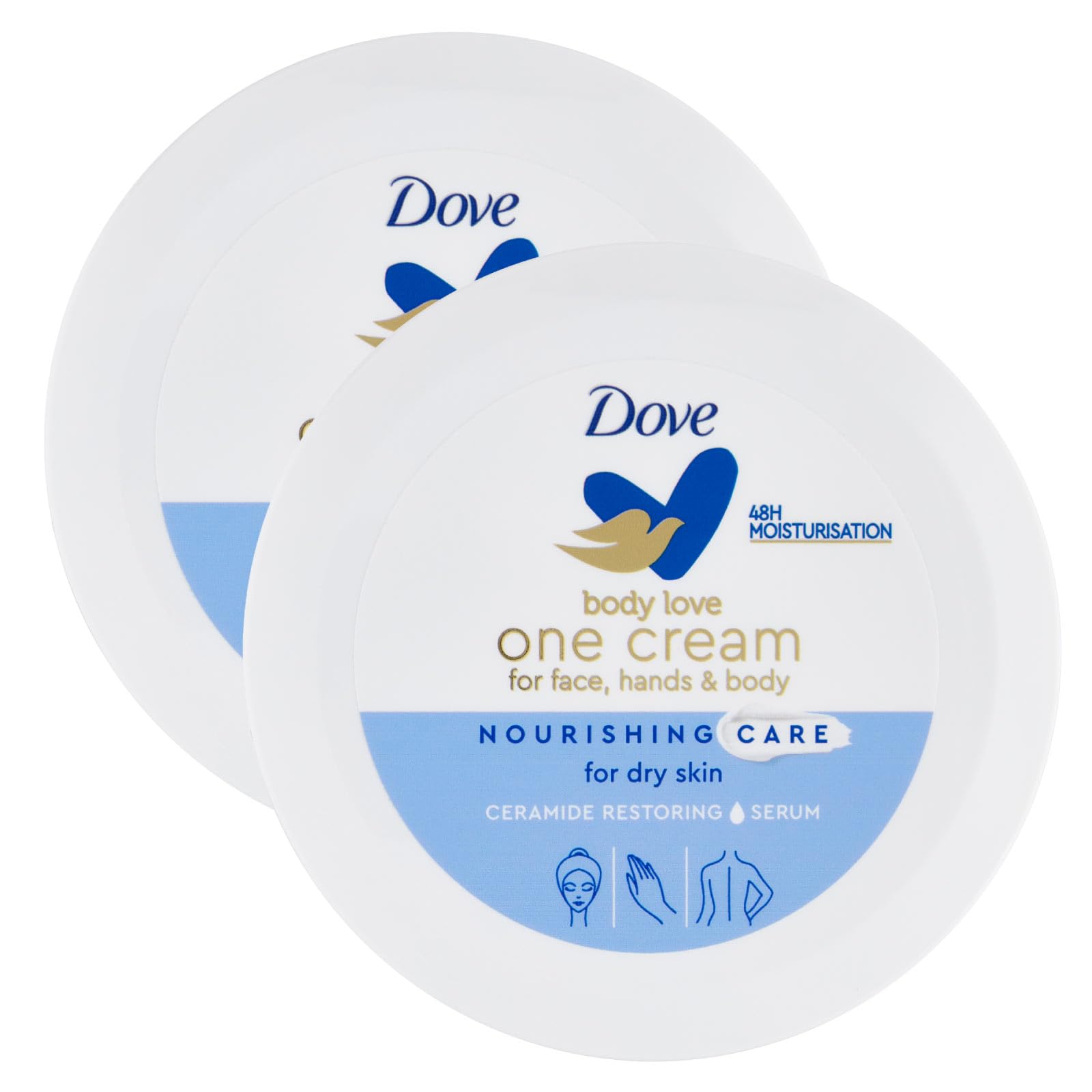 Dove One Cream Nourishing Cream is a face, hand, and body cream, ideal for dry skin. It nourishes the skin, leaving it soft, supple, and moisturized for 48 hours after each application. The formula is enriched with Ceramide Restoring Serum, a complex that promotes the production of ceramides, which strengthen the skin barrier and maintain hydration. Dermatologically tested. For soft skin every day, apply the cream with gentle, circular motions and reapply throughout the day if you feel you still need extra hydration.Repeat this process throughout the day if you still need extra hydration. For soft skin, apply the cream daily with a gentle circular motion. The formula is enriched with Ceramide Restoring Serum, a complex that promotes the production of ceramides, which strengthen the skin barrier and keep it hydrated. This face, hand, and body cream is perfect for dry skin, nourishing and leaving it soft, supple, and moisturized for 48 hours. The set includes: 2 jars of Dove One Cream Nourishing Cream, 250 ml each.Dove One Cream Crème nourrissante pour le visage, les mains et le corps, pour peaux sèches, absorption rapide, hydratation pour 48 h – 2 bocaux de 250 ml 2 x crème nourrissante de 250 mlDESCRIPTION DU PRODUIT Dove One Cream Crème nourrissante est une crème pour le visage, les mains et le corps, idéale pour les peaux sèches, qui nourrit la peau en la laissant douce, élastique et hydratée pendant 48 heures après chaque application. La formule est enrichie en Ceramide Restoring Serum, un complexe qui favorise la production de céramides qui renforcent la barrière de la peau et la maintiennent hydratée. Testé sous contrôle dermatologique. Pour avoir une peau douce tous les jours, appliquez la crème avec des mouvements doux et circulaires et répétez l'opération pendant la journée si vous avez la sensation d'avoir encore besoin d'un peu d'hydratation.Répétez cette opération pendant la journée si vous avez encore besoin d'un peu d'hydratation. Pour une peau douce, appliquez quotidiennement la crème avec un cercle délicat. La formule est enrichie en sérum Ceramide Restoring, un complexe qui favorise la production de céramides qui renforcent la barrière de la peau et la maintiennent hydratée. Crème pour le visage, les mains et le corps, parfaite pour la peau sèche, nourrit la peau, la laissant douce, élastique et hydratée pendant 48 heures. Le lot comprend : 2 pots de crème nourrissante Dove One Cream de 250 ml chacun.