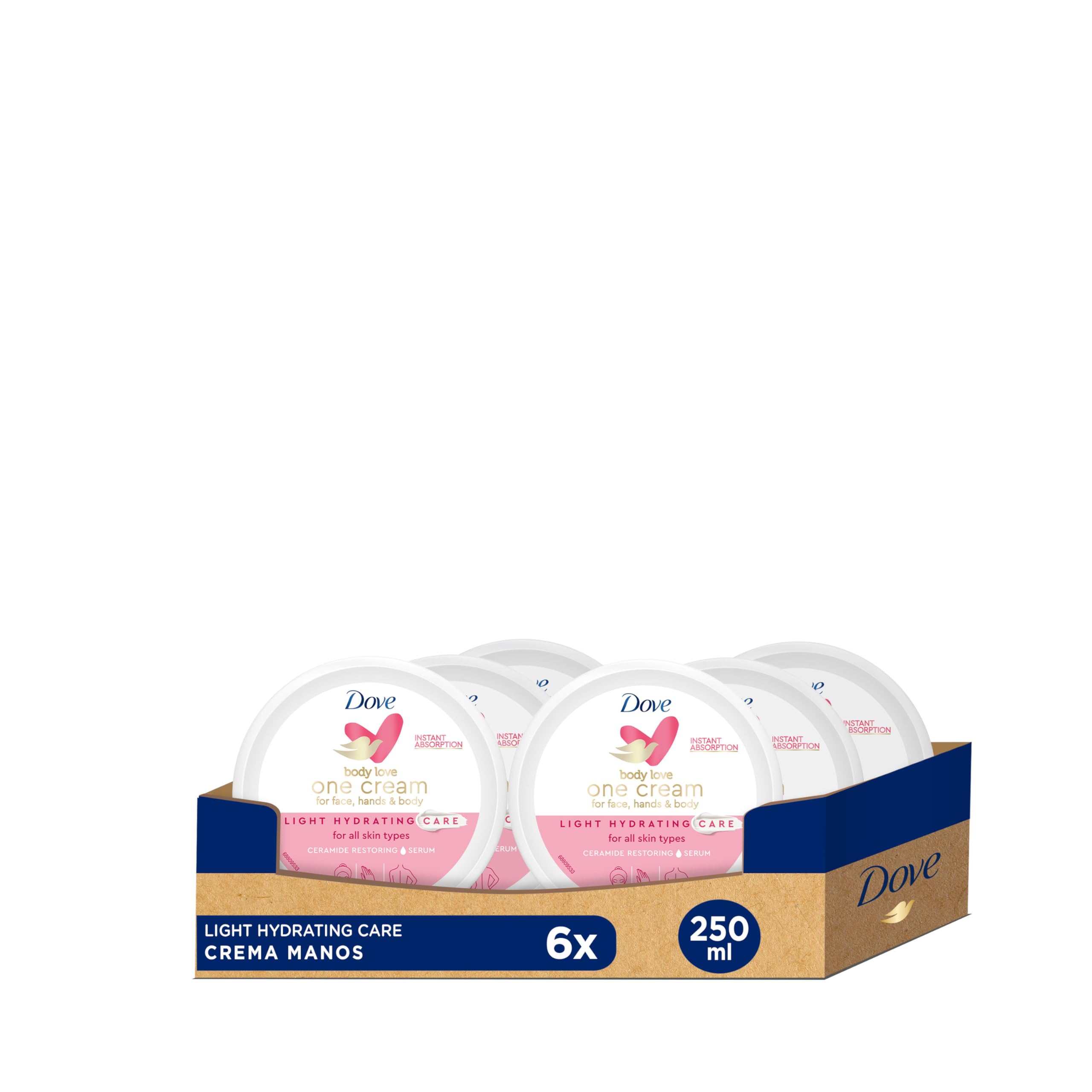 Dove One Cream Light is a refreshing cream designed for the face, hands, and body. It's infused with Ceramides Restore Serum, a unique blend of ingredients that work with your body to create ceramides that strengthen your skin's barrier function all over. This moisturizing face, hand, and body cream for all skin types is the perfect addition to your skincare routine, leaving your skin soft from head to toe. Radiant, fresh, and soft skin: This multi-purpose cream moisturizes without leaving a greasy feeling on the face, hands, and body, helping to improve the look and feel of your skin with regular use. This cream melts into the skin and provides 24-hour hydration. It's dermatologically tested and can be used daily. This moisturizer is even light enough to wear under makeup. To use, dispense a generous amount of cream into your hands and massage the non-greasy formula onto your skin. You can use this light, multi-purpose cream all over your body to give your skin a boost of freshness and hydration after showering. Give your body the radiance and love it deserves with this fast-absorbing cream. Dove does not test on animals. Information displayed on the website may differ from the information on the product label. Always check the product label.A daily multi-purpose cream that moisturizes without leaving a greasy feeling and leaves your skin soft from face to toe. Its instant-absorbing formula provides moisture that's light enough to use under makeup. Formulated with ceramide-restoring serum, it helps strengthen the skin's natural barrier and provides hydration. This fast-absorbing, multi-purpose moisturizing cream for face, hands, and body provides up to 24 hours of hydration suitable for all skin types, even as a day cream. Dove Light Moisturizing Cream for Body, Hands, and Face for All Skin Types, 24-Hour Moisture, Fast Absorption, 250ml - Pack of 6.Dove One Crème légère hydratante pour le corps, les mains et le visage 250 ml (rose) Lot de 6DESCRIPTION DU PRODUIT Dove One Cream Light est une crème rafraîchissante, conçue pour le visage, les mains et le corps. Elle est imprégnée du Sérum Restaure Ceramides, un mélange unique d'ingrédients qui travaille avec votre corps pour créer des céramides qui renforcent les fonctions de barrière de votre peau sur tout votre corps. Cette crème hydratante pour le visage, les mains et le corps pour tous les types de peaux est le complément optimal à votre routine de soins laissant votre peau douce du visage aux pieds. Une peau éclatante, fraîche et douce : cette crème multi-usages hydrate sans laisser de sensation grasse sur le visage, les mains et le corps en aidant à améliorer l'apparence et le toucher de votre peau avec une utilisation régulière. Cette crème fond avec la peau et fournit une hydratation de 24 heures, elle est testée dermatologiquement et peut être utilisée quotidiennement. Ce soin hydratant est même assez léger pour pouvoir l'utiliser sous le maquillage. Pour l'utiliser, mettez une quantité généreuse de crème dans vos mains et massez la formule non grasse sur votre peau. Vous pouvez utiliser cette crème multi-usages légère sur tout le corps, pour apporter un coup de pouce de fraîcheur et d'hydratation à votre peau après la douche. Donnez à votre corps l'éclat et l'amour qu'il mérite avec cette crème à absorption rapide. Dove ne teste pas sur les animaux. Les informations affichées sur le site Web peuvent différer des informations qui apparaissent sur l'étiquetage du produit. Veuillez toujours vérifier l'étiquette du produit.Crème multi-usage quotidien qui hydrate sans laisser de sensation grasse et laisse votre peau douce du visage aux pieds. Formule d'absorption instantanée qui fournit une hydratation suffisamment légère pour être utilisée sous le maquillage. Conçu avec le sérum restaure les céramides qui aide à renforcer la barrière naturelle de la peau et lui procure une hydratation. Crème hydratante multi-usages à absorption rapide pour le soin du visage, des mains et du corps qui fournit jusqu'à 24 heures d'hydratation convient à tous les types de peau, même comme crème de jour. Dove Crème légère hydratante pour le corps, les mains et le visage pour tout type de peau 24h d'hydratation rapide absorption 250 ml - Pack de 6.