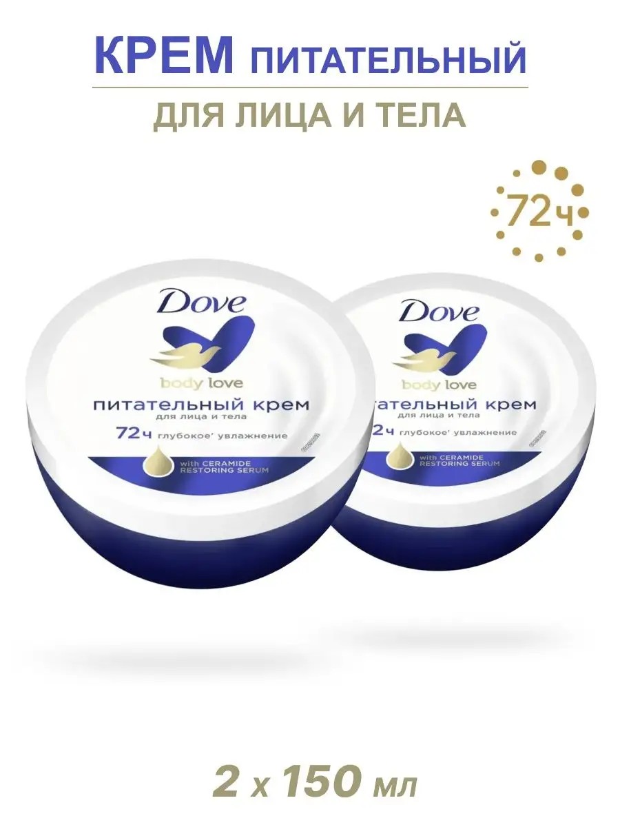 DOVE крем питательный 150 мл. Dove крем Питательный универсальный для кожи лица и тела создает ощущение комфорта и свежести. Формула Ceramide Restoring Serum способствует формированию естественного защитного барьера кожи, сохраняющего её влагу и красоту. Разделите с Dove концепцию любви и заботы о своем теле — подарите коже защиту и увлажнение с кремом Dove, действующим 72 часа! Станьте увереннее вместе с Dove и проектом повышения самооценки, в котором уже получили поддержку миллионы молодых людей по всем миру!