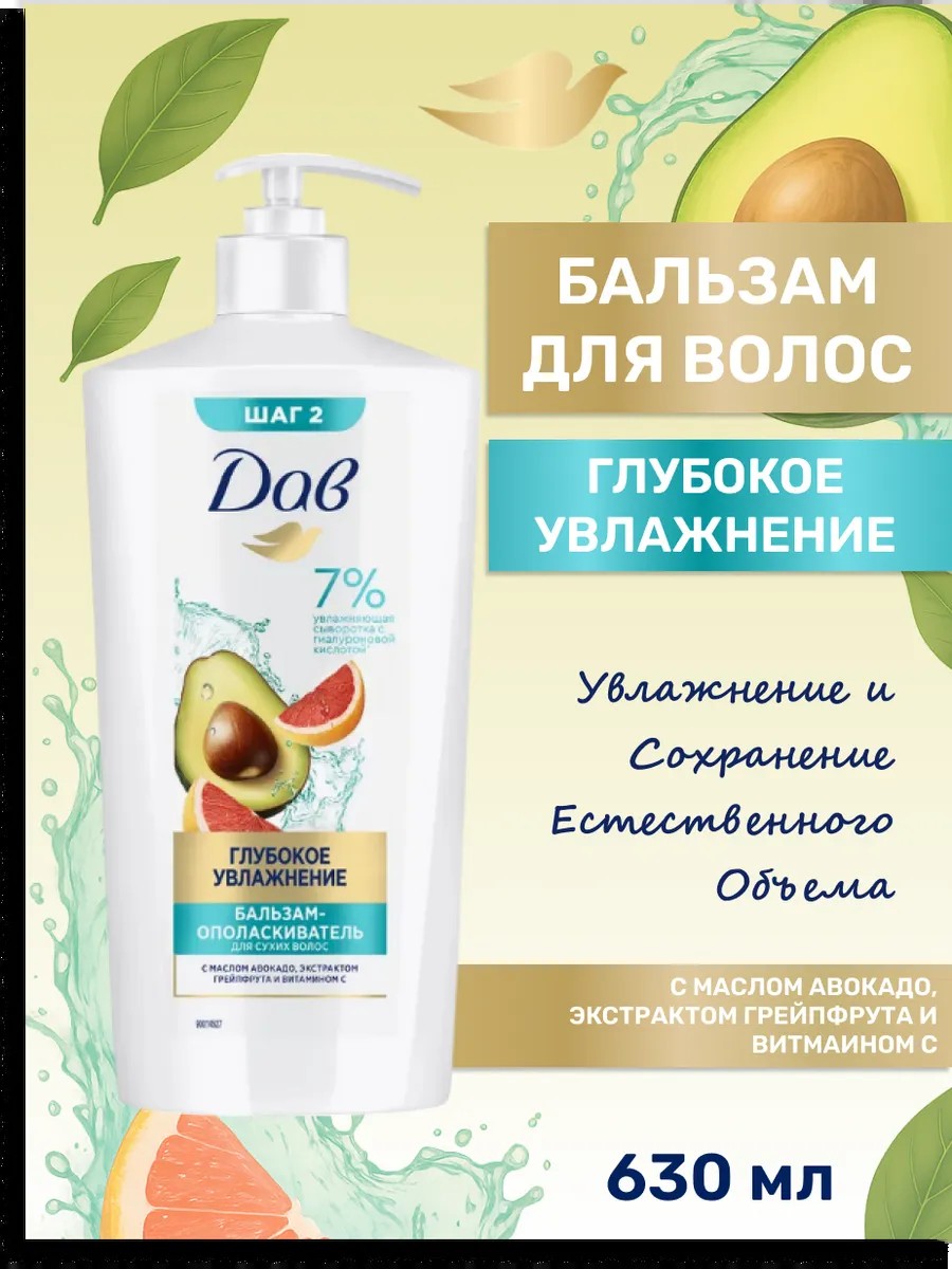 Совет от Дав: для наилучшего результата используйте бальзам-ополаскиватель для увлажнения волос каждый раз после мытья головы. Объем средства – 630 мл.