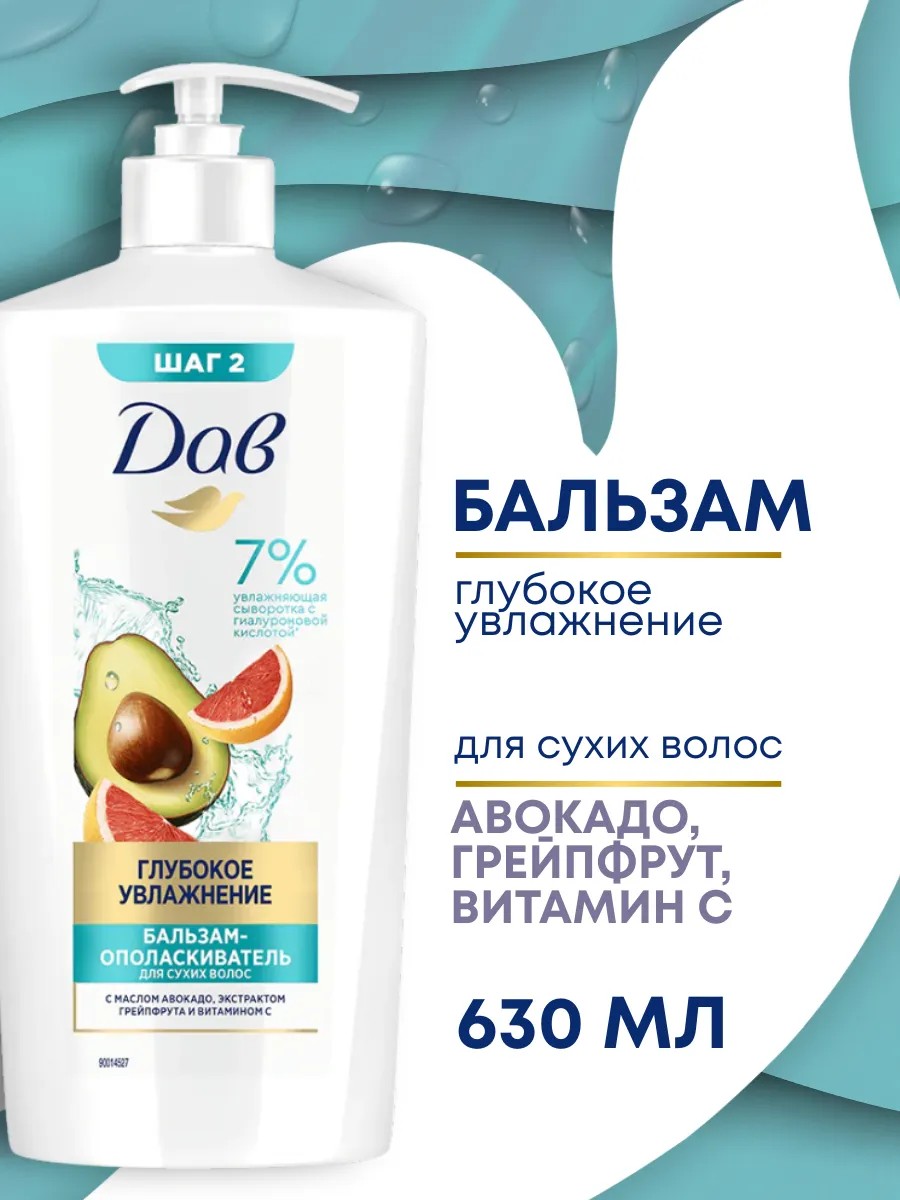 Новая серия продуктов для волос Дав с уникальной^ двойной формулой предназначена для глубокого увлажнения' и сохранения естественного объема локонов. Бальзам-ополаскиватель из новой серии Дав облегчает расчесывание волос. Средство подходит для всех типов волос, а особенно для сухих. Кондиционер для волос увлажняющий содержит 7% увлажняющую сыворотку с гиалуроновой