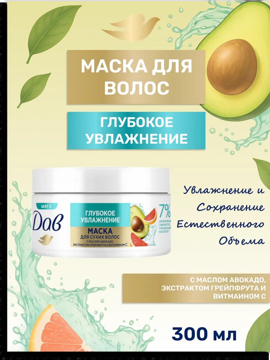 | Полное наименование товара | Маска для волос Дав Увлажняющая и питательная с гиалуроновой кислотой и маслом авокадо 300 мл |