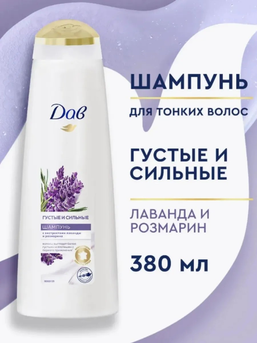 Используйте шампунь питательный Лаванда и розмарин, и уже после первого мытья ваши волосы будут выглядеть более упругими, плотными и сильными*. Очищающий шампунь для тонких волос с экстрактами лаванды и розмарина поставляется в объеме 380 мл. Шампунь для волос женский Дав – настоящая находка для ваших локонов! Для максимального результата рекомендуем воспользоваться бальзамом-ополаскивателем Густые и сильные после мытья головы.