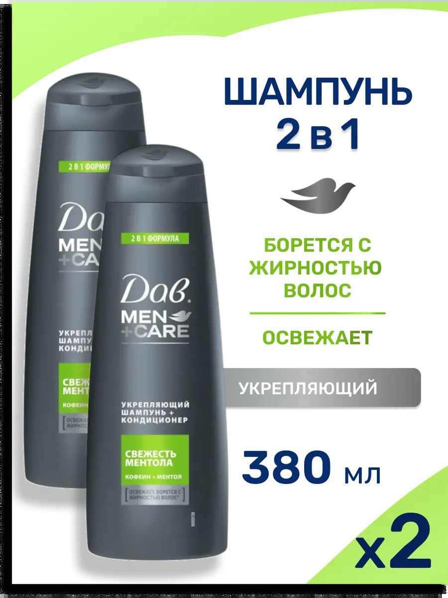Шампунь Дав Men + Care Укрепляющий свежесть ментола очищает кожу головы, придает волосам здоровый блеск 2 шт по 380 мл.