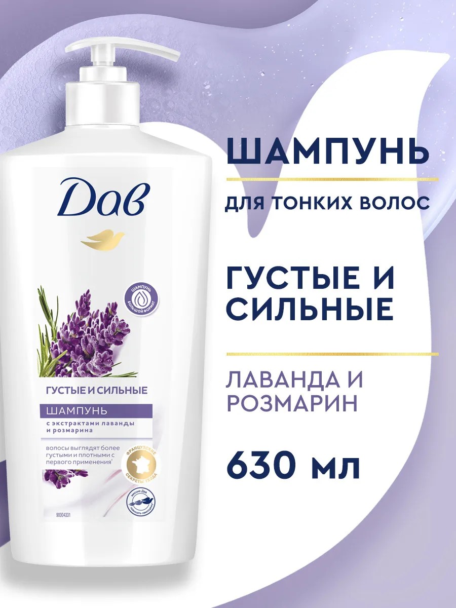 Шампунь для волос Дав имеет приятный аромат, который расслабляет вас и дарит ощущение спокойствия. Шампунь Дав дает густую пену, которая нежно обволакивает каждую прядь, позволяя активным компонентам проникнуть в структуру волоса. Используйте шампунь питательный Лаванда и розмарин, и уже после первого мытья ваши волосы будут выглядеть более упругими, плотными и сильными*.