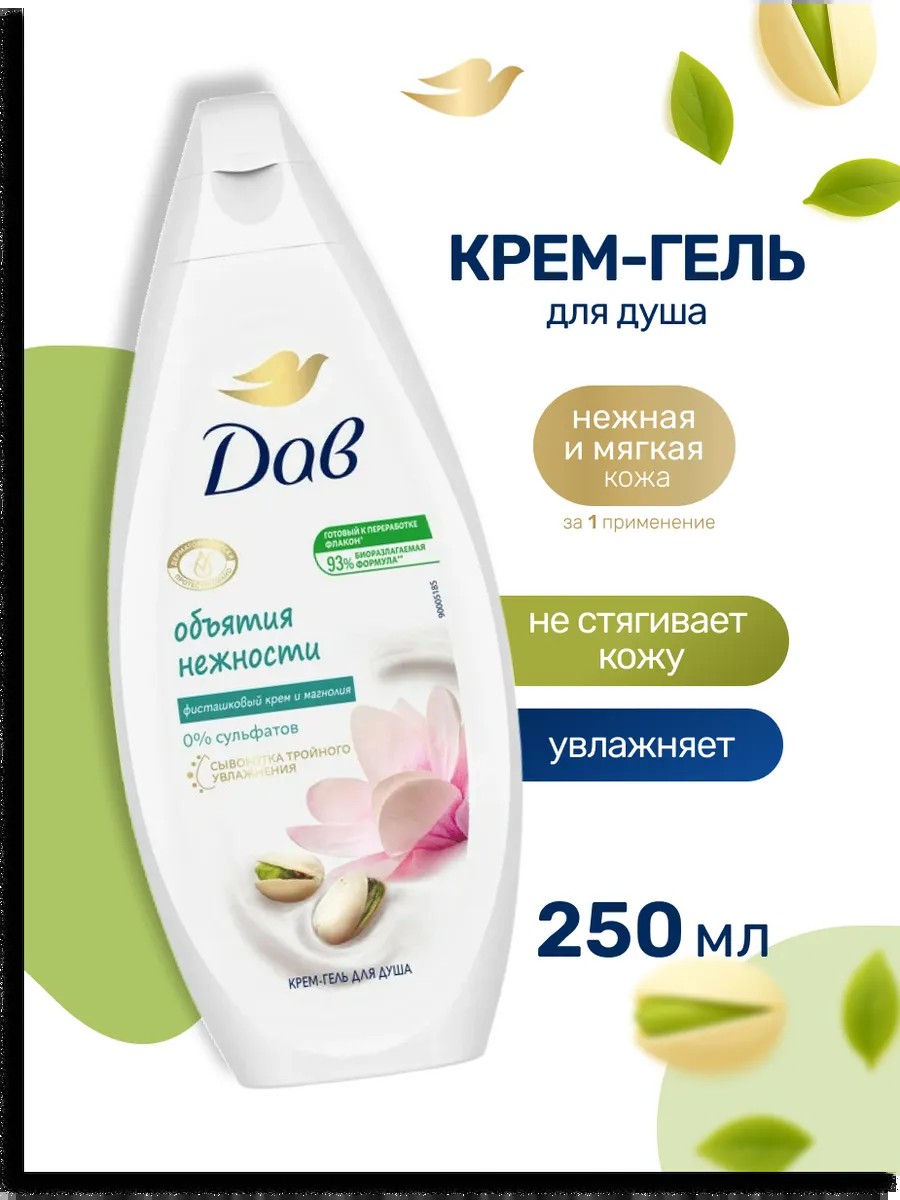 Крем-гель для душа Дав Фисташка и магнолия - это то, что нужно для бережного ухода за кожей! Для чистоты и свежести в течение дня дополните гель для душа женский увлажняющий применением антиперспиранта Дав. Для наилучшего результата воспользуйтесь молочком для тела Дав после ванной. Попробуйте также другие гели для душа из обновленной линейки Дав и выберите идеальный для себя!
