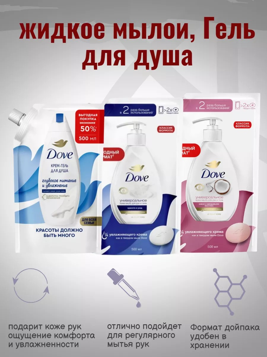 3)Гель для душа DOVE Глубокое питание и увлажнение, 500 мл. Попробуйте крем-гель для душа Dove для всей семьи Глубокое питание и увлажнение и почувствуйте, как кожа стала вновь ухоженной и увлажненной сразу после душа.