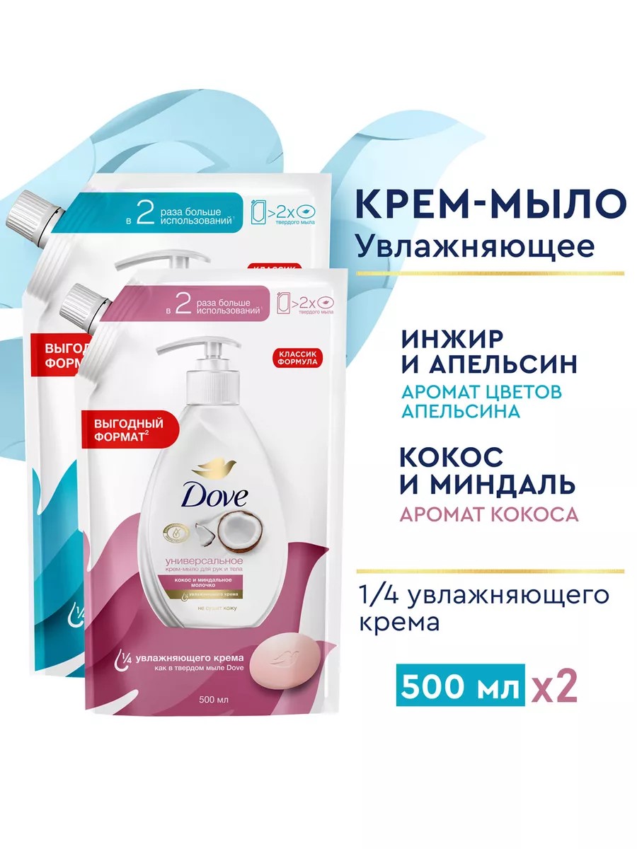 Сменные блоки для универсального жидкого крем-мыла Dove «Инжир и лепестки апельсина» и «Кокос и миндальное молочко» подарят коже рук ощущение комфорта и увлажненности. В наборе 2 упаковки объемом 500мл в удобном дой-паке. Средство бережно и качественно очищает кожу от загрязнений за секунды. На 1/4 состоит из увлажняющего крема, благодаря чему помимо очищения также интенсивно питает кожу ручек в течение 24 часов. Мыло помогает сохранять естественный водный баланс. Деликатное средство для мытья рук сделает кожу нежной и гладкой. Образует мягкую пенку. Имеет нейтральный рН, естественный для кожи. На 95% биоразлагаемая формула. Используйте каждый день для ощущения комфорта. Подходит для всех типов женской и мужской кожи, но идеально для сухой. Для гигиены рук, тела и ног.