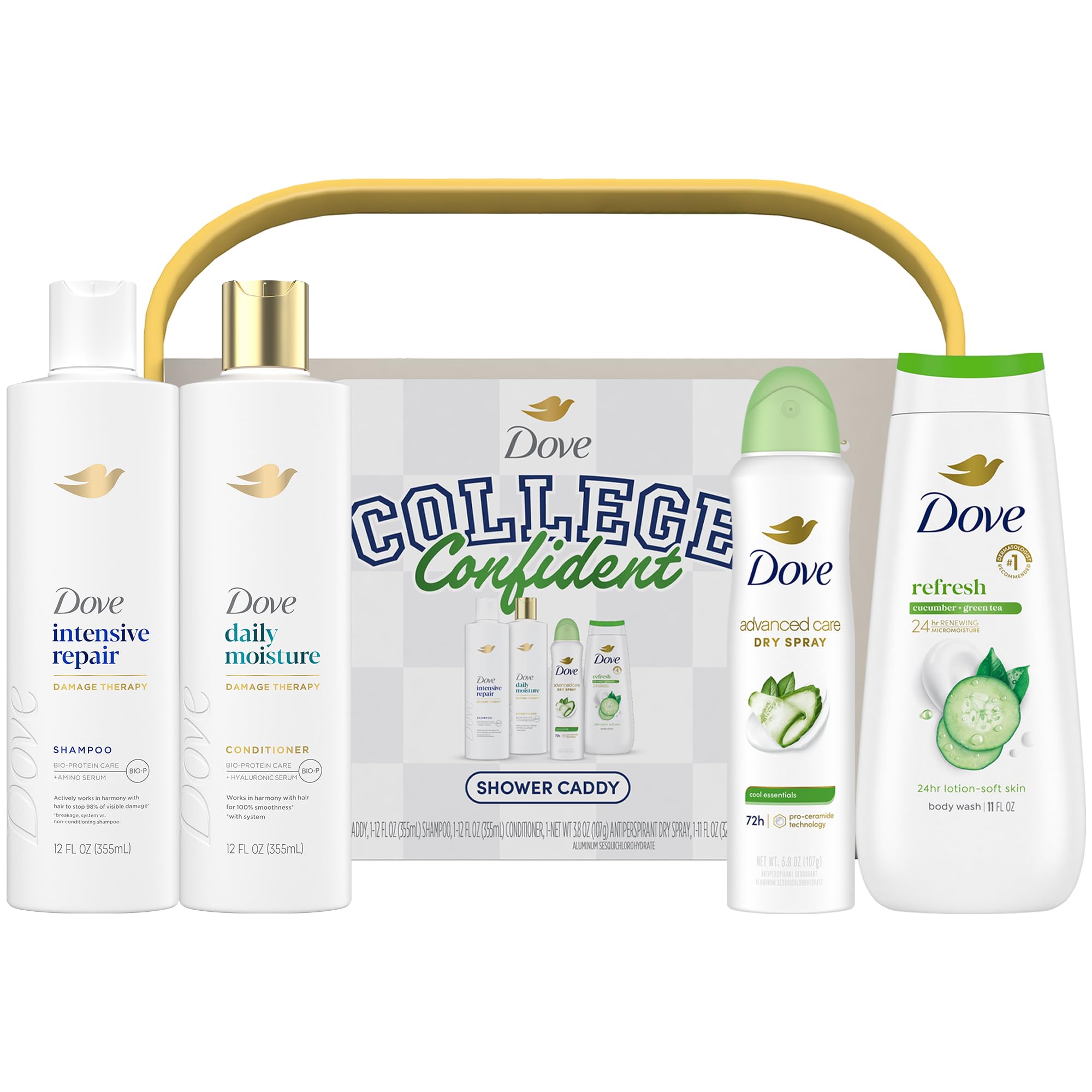 DOVE IS PETA-APPROVED: Since the mid-1980s, Dove has used cruelty-free, non-animal methods to ensure the safety of all Dove skin care products. 72-HOUR ODOR AND WETNESS PROTECTION: Dove Advanced Care Dry Spray Deodorant provides up to 72 hours of protection with a cool cucumber and green tea scent, plus ¼ moisturizers to care for underarm skin. HYDRATING SHAMPOO CONDITIONER: The Intensive Repair shampoo and Daily Moisture conditioner target damage to visibly reduce signs of breakage and restore smoothness and strength to hair. DEEPLY HYDRATING BODY WASH: The Dove Cucumber Green Tea Body Wash is formulated with Dove's signature plant-based moisturizers and gentle cleansers to nourish skin and maintain its natural moisture barrier. COMPLETE PERSONAL CARE SET: Need college girl gift ideas? Inside a "College Confident" shower caddy, she'll receive a Dove Cucumber Green Tea Body Wash (11 oz), Intensive Repair Shampoo (12 oz), Daily Moisture Conditioner (12 oz), and a Cool Essentials Deodorant Spray (3.8 oz).
