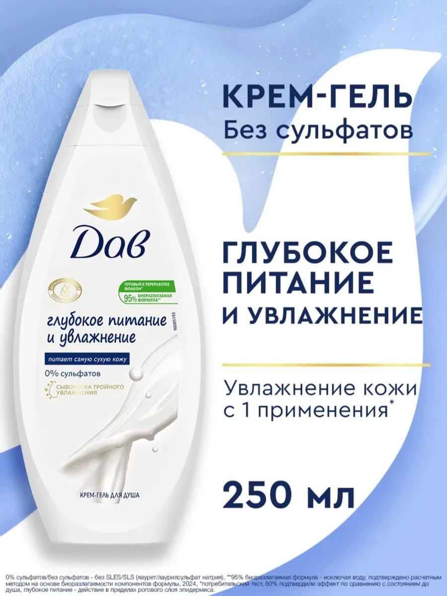 Бессульфатный гель для душа Dove экономично расходуется, создавая пышное облако пены всего от одной капли. Уходовое средство превращает обычный прием душа в приятный расслабляющий спа-ритуал. Увлажняющий гель для душа разработан на основе 95% биоразлагаемой формулы. Женский гель для душа смягчает и увлажняет кожу всего за 1 применение. Гель для душа маленький объем (250 мл) очень удобно взять с собой в дорогу, в спортивный зал, в командировку. Крем-гель для душа 250 мл женский поместится практически в любой сумке. Дав гель для душа поставляется в готовом для переработки флаконе''.