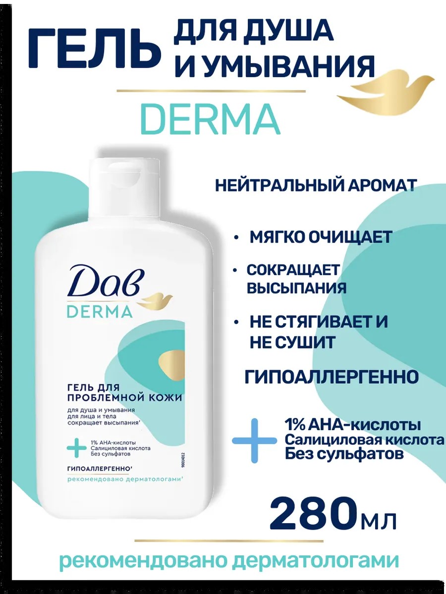 | Полное наименование товара | Гель для душа и умывания для лица и тела Дав Derma очищающий, от прыщей гипоаллергенный, 280 мл |