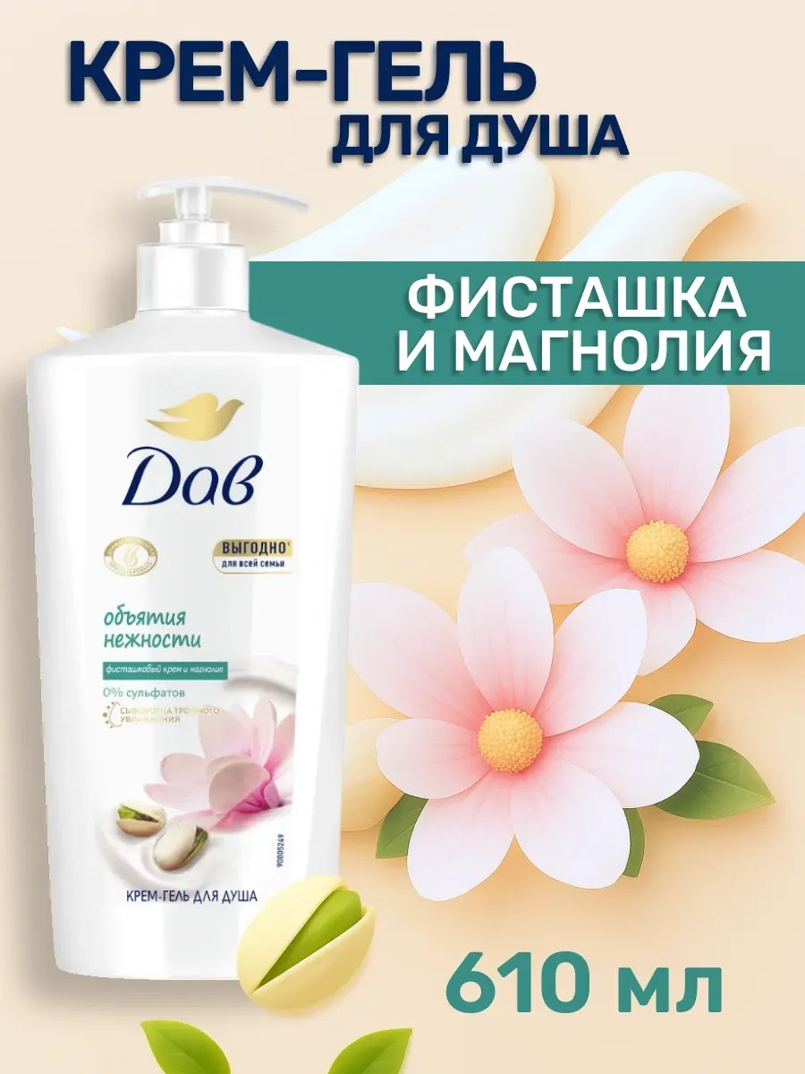 Очищающий крем-гель для душа Дав Фисташковый крем и магнолия превратит уход за кожей в приятный расслабляющий спа-ритуал.