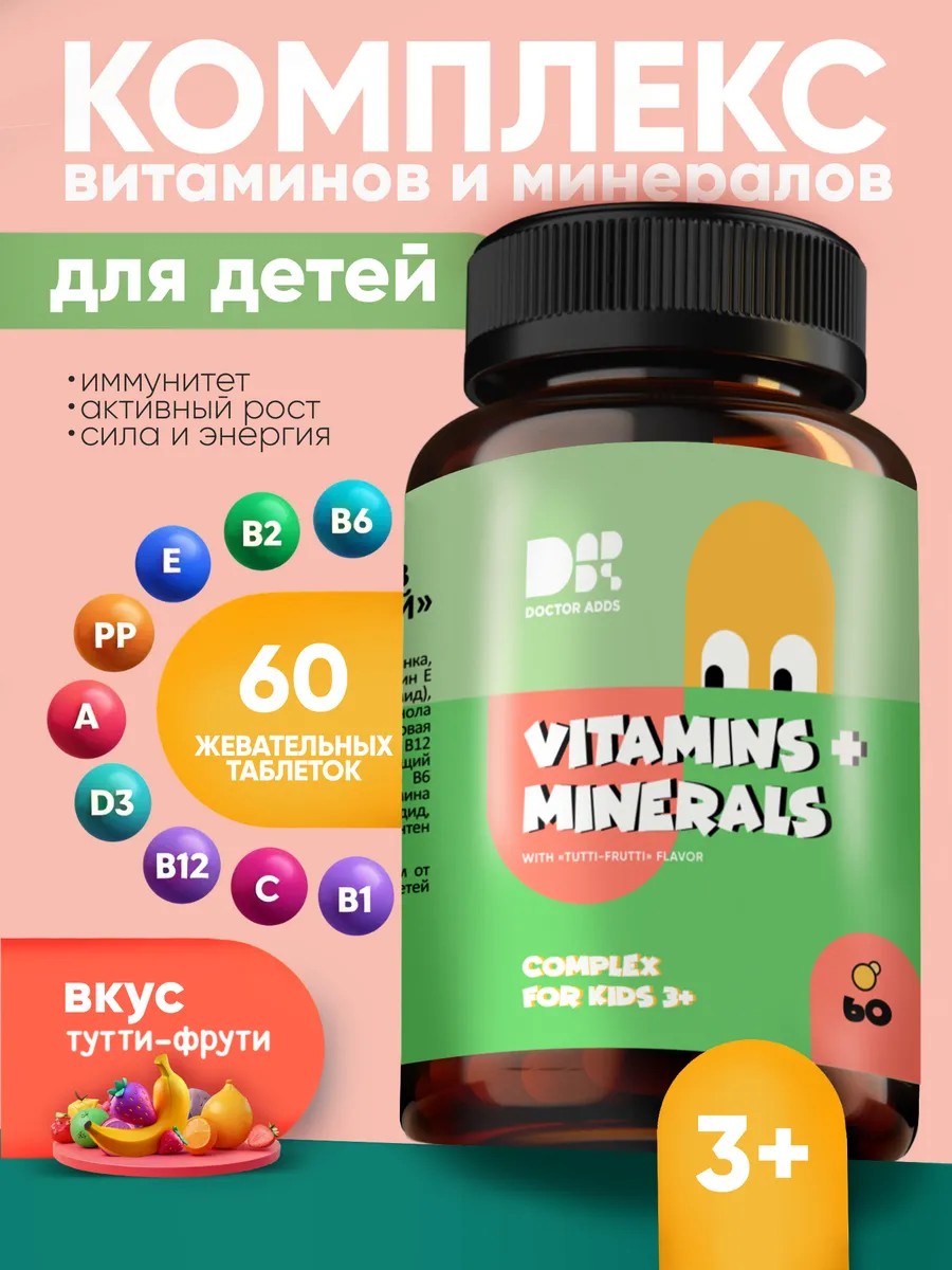Мультивитаминный комплекс - это вкусное и полезное дополнение для питания детей и подростков, обеспечивающее растущий организм необходимыми витаминами и минералами. Наш витаминный комплекс, богатый мультивитаминами, играет важную роль в поддержании здоровья и развитии. Витамин А поддерживает зрение, здоровье кожи, ногтей и волос. Витамины группы В (в1, b2, B3, b5, b6, b7, b9, b12) улучшают работу нервной системы, помогая бороться с усталостью и стрессом. Витамин С повышает иммунитет, укрепляет сосуды и способствует заживлению ран. Витамин D3 улучшает кальциевый обмен для формирования костей. Витамин Е – антиоксидант, защищающий клетки от повреждений. Наши таблетки имеют приятный вкус тутти-фрутти, легко усваиваются и подходят для детей от 3 лет, способствуя правильной работе мозга, кровообращения и нервной системы. Поливитамины рекомендованы для поддержки здоровья, иммунитета и профилактики простуды, а также улучшают концентрацию, что важно для обучения. Выбирая витаминный комплекс Dr.Adds, вы дарите ребенку натуральные и полезные витамины без добавок и сахара. Это идеальный подарок и спортпит для активных детей. Данные бады поддержат бодрость и помогут достигать спортивных успехов. Этот сбалансированный комплекс, обогащен детским витамином а, витамином Е (как и витамины а и е), витамином D3, витамином РР, пантотеновой кислотой, витаминами группы B, цитратом цинка, калия йодидом, селеноксантеном и глюкозой. Рекомендовано принимать 1 жевательную таблетку в день, этот комплекс подходит как детские витамины, а также витамины для подростков, и витамины для школьников. Позаботьтесь о здоровье вашего малыша с нашими мульти витаминами! Это вклад в его здоровое будущее, используя данный комплекс мульти витаминов для подростков. Зарядись энергией, расти здоровым и радуй близких!