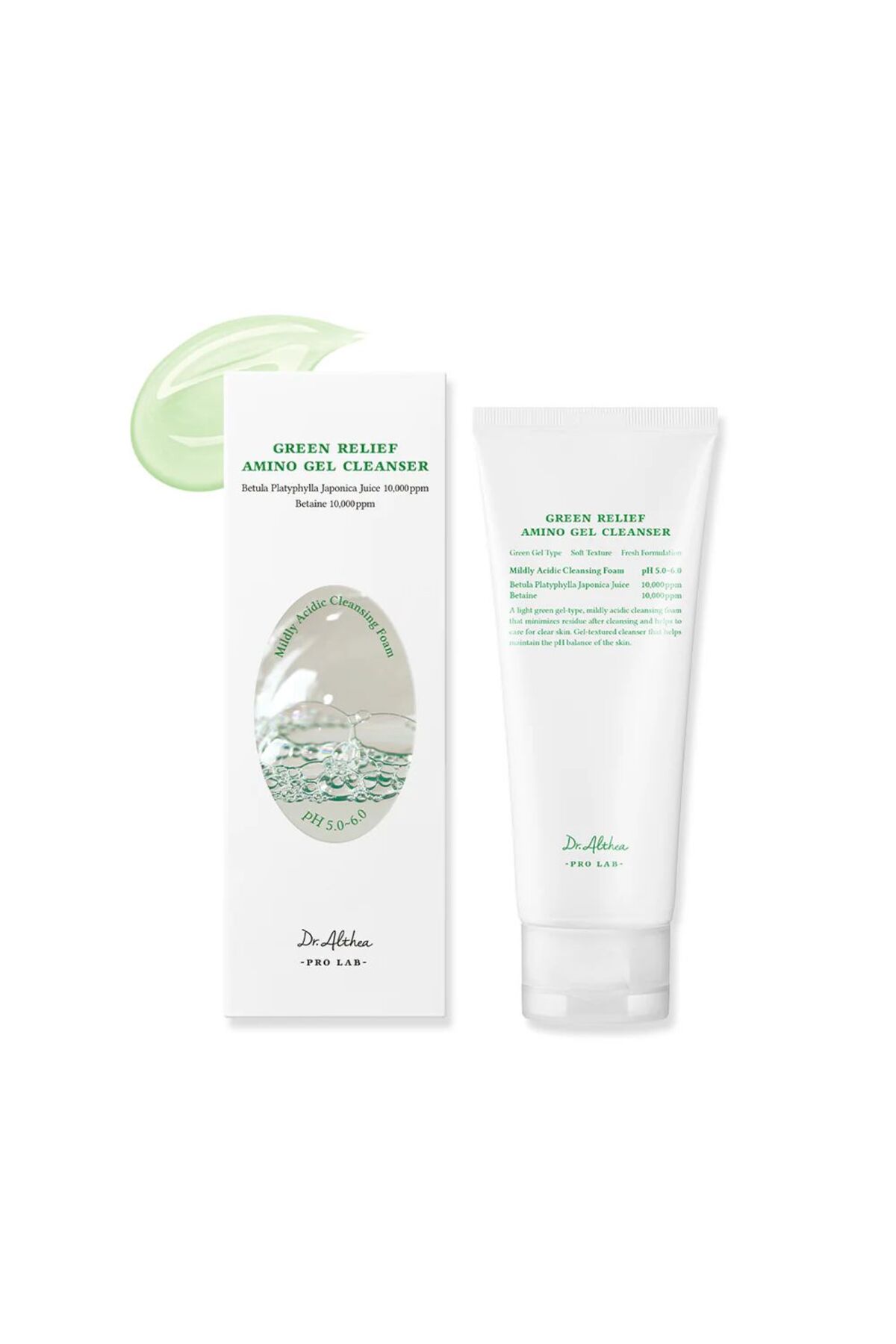 Amino asitli jel-köpük temizleyiciDr. Althea Green Relief Amino Gel Cleanser, cildi tüm kirlerden ve makyaj kalintilarindan nazikçe temizlemek için tasarlanmistir. Nazik vegan bilesimi tahrise neden olmaz ve en hassas ciltler için bile uygundur. Hafif asit formülü pH5.0-6.0 yikama sonrasi kuruluga ve gerginlige neden olmaz.