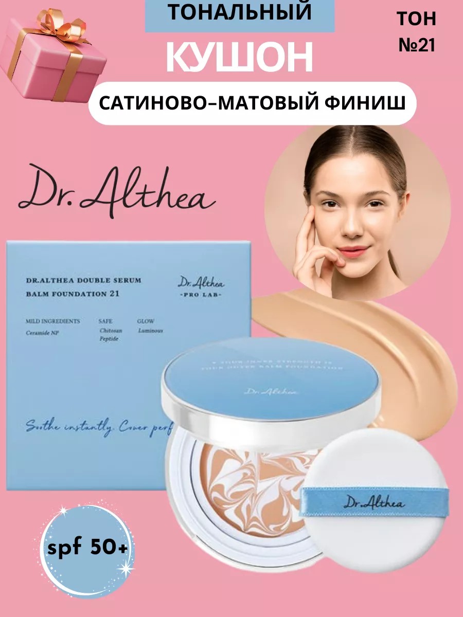 Тональный кушон Dr.Althea Double Serum Balm Foundation – это инновационный продукт для ухода за кожей, который представляет собой комбинацию сыворотки и тонального крема в 1 флаконе.