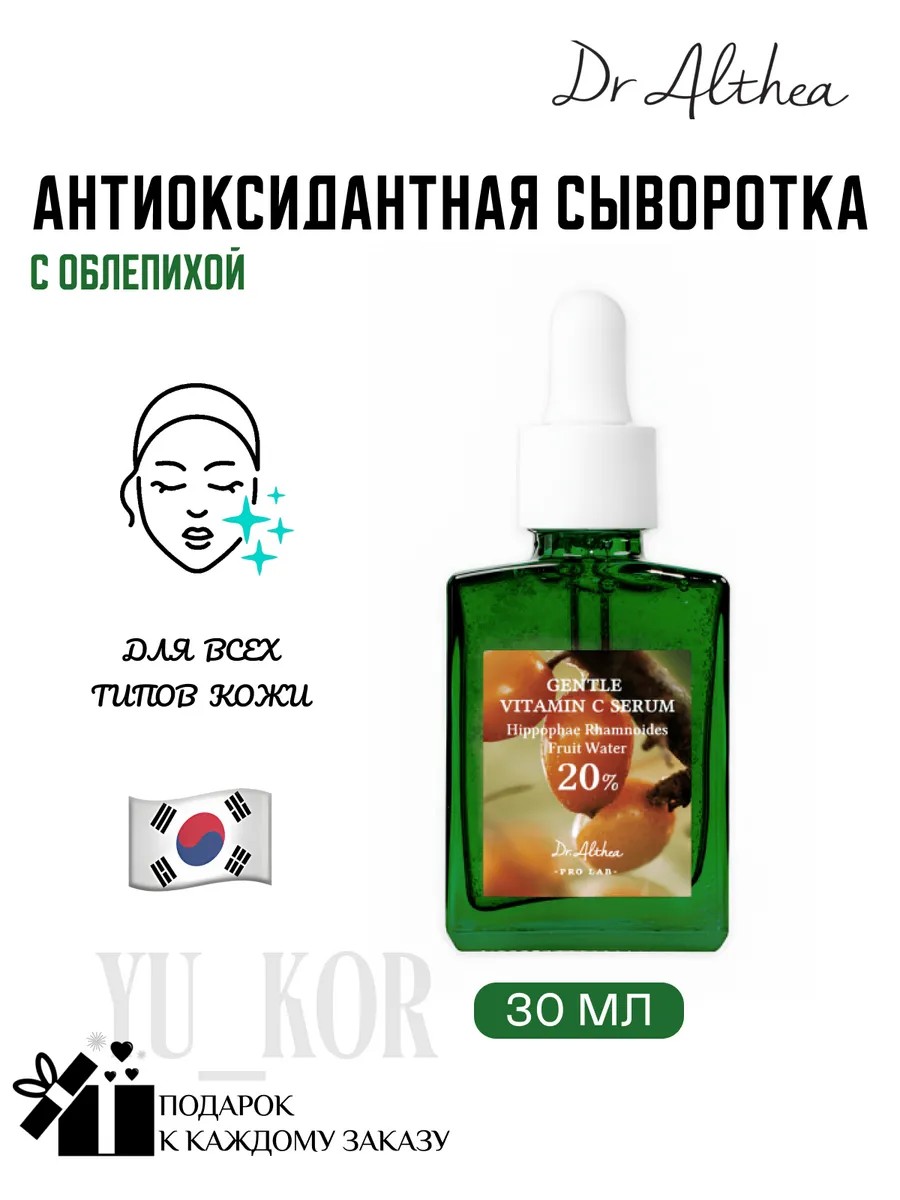 Антиоксидантная сыворотка с облепихой для проблемной кожи Dr. Althea Gentle Vitamin C Serum насыщает витаминами, устраняет тусклый и неоднородный тон, деликатно осветляя следы акне и застойные пятна. Заметно улучшает цвет лица, дарит ему здоровое сияние и тонизирует. Оптимизирует защитные функции кожи, укрепляет локальный иммунитет, эффективна в профилактике акне. Содержит ниацинамид, экстракт облепихи, зелёного чая и витамин С.