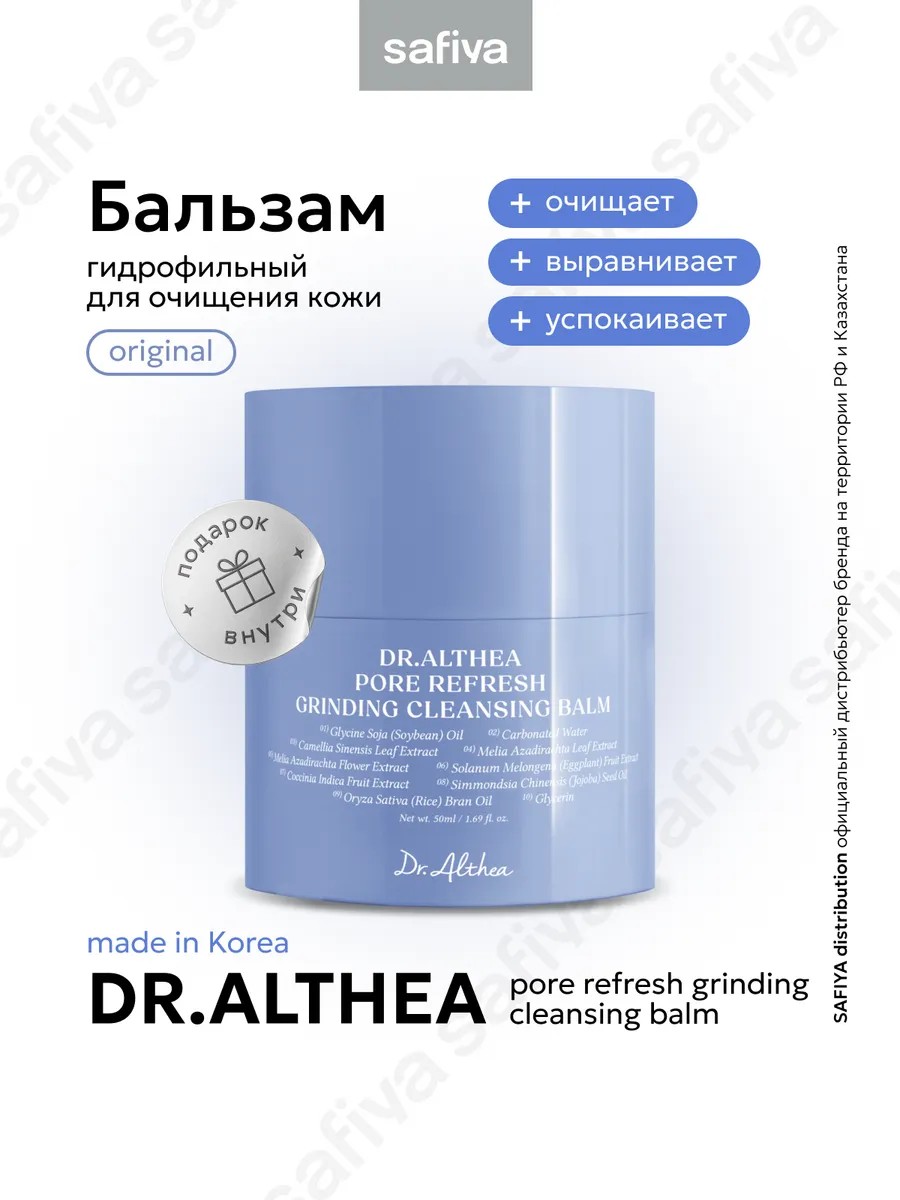 Очищающий бальзам Dr.Althea Pore Refresh Grinding Cleansing Balm с инновационным механизмом помола, встроенным прямо в упаковку, и текстурой сорбета обеспечивает гигиеничное и удобное использование — без необходимости прикасаться к продукту руками.
