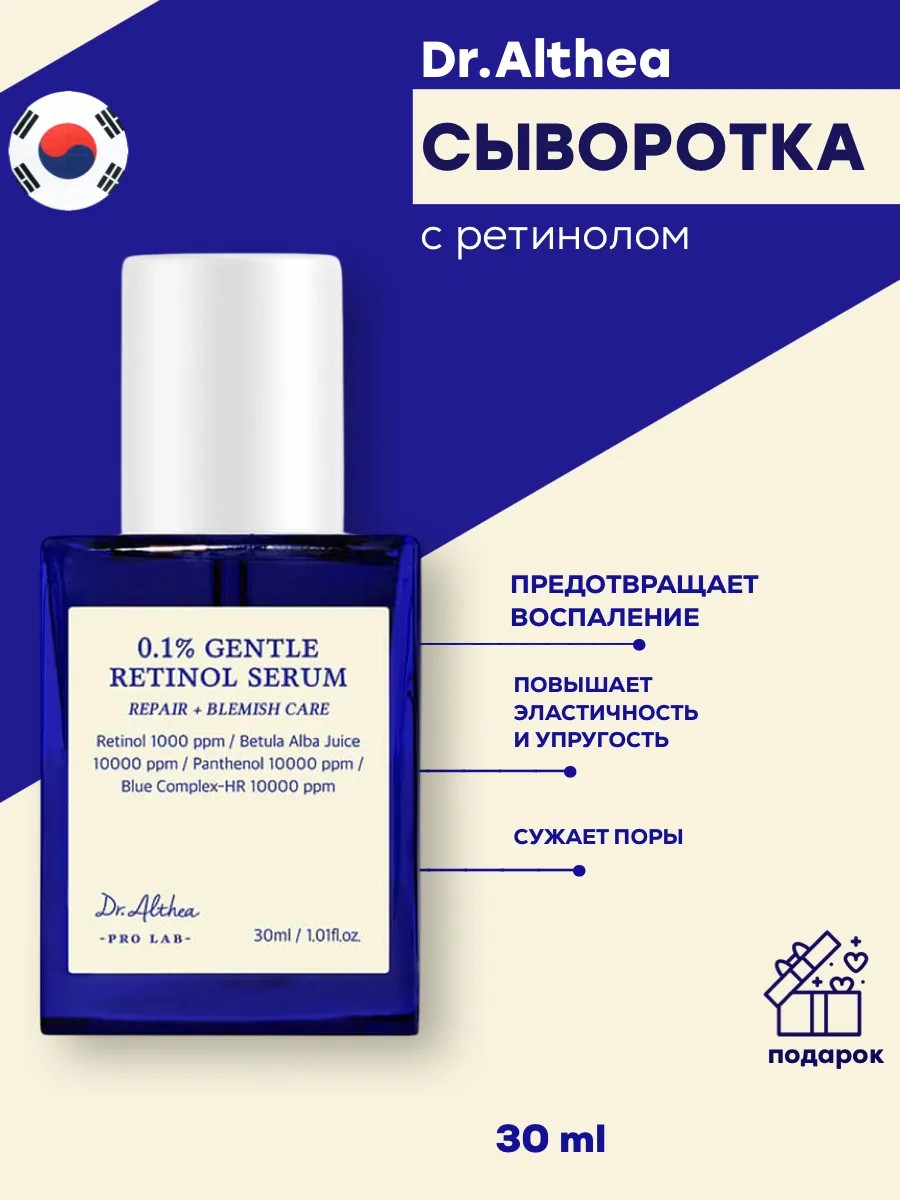 Сыворотка с 0,1% ретинола и бакучиолом от Dr.Althea представляет собой инновационное средство для ухода за кожей, предназначенное для борьбы с признаками старения и улучшения общего состояния кожи. Этот продукт сочетает в себе высококонцентрированный ретинол, известный своей способностью стимулировать обновление клеток и уменьшать видимость мелких морщин, с бакучиолом, который способствует увлажнению и укреплению кожи.