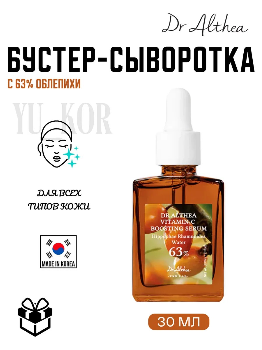 Укрепляющая бустер-сыворотка с 63% облепихи Dr. Althea Vitamin C Boosting Serum 63% — это усиленная версия сыворотки с витаминным комплексом от Dr. Althea, которая содержит повышенную концентрацию активов. Осветляет пигментацию, выравнивает тон и рельеф, оказывает противовоспалительное действие и замедляет процесс старения. Поддерживает упругость, эластичность и гладкость кожи, придаёт здоровое сияние. Содержит 63% воды облепихи, 2 формы витамина C, ниацинамид, транексамовую кислоту, альфа-арбутин, коэнзим Q10, экстракт центеллы, церамиды, пантенол и гиалуроновую кислоту.